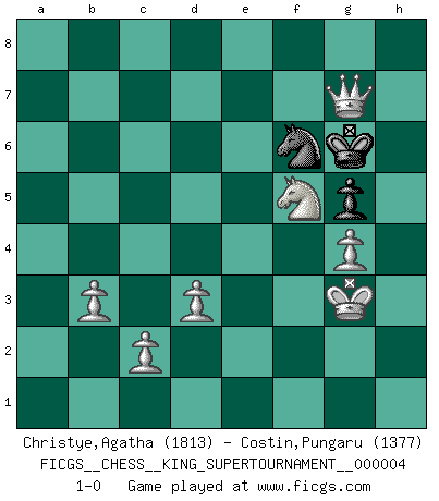 Last move : 1-0 2019 April 15 21:33:23 [Event "FICGS__CHESS__KING_SUPERTOURNAMENT__000004"] [Site "FICGS"] [Date "2018.12.16"] [Round "1"] [White "Christye,Agatha"] [Black "Costin,Pungaru"] [Result "1-0"] [WhiteElo "1813"] [BlackElo "1377"] 1.e4 e5 2.f4 d6 3.d3 g6 4.g3 exf4 5.Bxf4 Bg7 6.Qc1 Nf6 7.Nc3 O-O 8.Bg2 Nc6 9.Nge2 Be6 10.O-O Nh5 11.Bh6 f5 12.exf5 Bxf5 13.h3 Be6 14.Bxg7 Kxg7 15.Rxf8 Qxf8 16.Qe3 Re8 17.Bxc6 bxc6 18.Qd4+ Kg8 19.Rf1 Qg7 20.g4 Qxd4+ 21.Nxd4 Ng7 22.Ne4 Rf8 23.Nf6+ Kh8 24.a4 c5 25.Nb5 h5 26.Nxc7 hxg4 27.hxg4 Bf7 28.Nfd5 Kg8 29.Ne7+ Kh7 30.Kg2 Kh6 31.Kg3 Kg5 32.b3 a5 33.Nc6 Be8 34.Rxf8 Bxc6 35.Rd8 Bb7 36.Rxd6 Kh6 37.Rb6 Bh1 38.Rb5 g5 39.Rxc5 Kg6 40.Rxa5 Bb7 41.Rb5 Bc8 42.a5 Kf6 43.a6 Bd7 44.a7 Bxb5 45.Nxb5 Ne6 46.a8Q Nf4 47.Qf8+ Kg6 48.Nd4 Nd5 49.Nf5 Nf6 50.Qg7+ 1-0 King's gambit Kingside Castling by player Black (move 7) Kingside Castling by player White (move 10) 10 pieces endgame at move 45 : White KNPPPPP , Black KNP WHITE : King + 1 Knight 5 Pawns BLACK : King + 1 Knight 1 Pawn Promotion Queen by player White (move 46) Player White won this chess game. Follow this game move after move (download)The mistakes are there, waiting to be made. (Savielly Tartakower) Nicht daß Diemer aus Opportunismus Mitglied der NSDAP geworden wäre. Er war ein Fanatiker, in allem, was er tat. (Hans Ree) El Ajedrez es en su esencia, un juego. En su forma, un arte. Y en su ejecución, una ciencia. (Baron Tassilo) Toutes les manuvres exécutées sur une colonne ouverte ont pour but ultime l'intrusion définitive sur la septième ou la huitième rangée, en plein cur de la position ennemie. (Aaron Nimzovitch) You cannot beat a roulette table unless you steal money from it. (Albert Einstein)