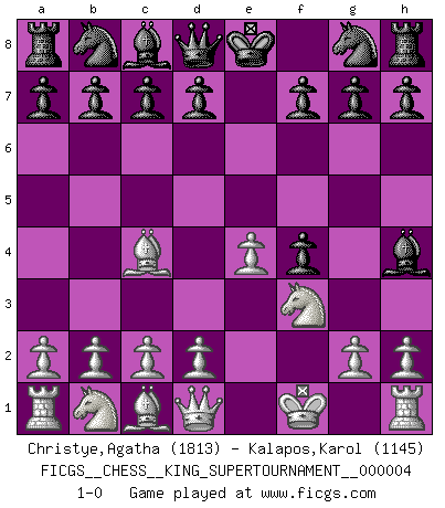 Last move : 1-0 2019 January 20 12:31:41 [Event "FICGS__CHESS__KING_SUPERTOURNAMENT__000004"] [Site "FICGS"] [Date "2018.12.16"] [Round "1"] [White "Christye,Agatha"] [Black "Kalapos,Karol"] [Result "1-0"] [WhiteElo "1813"] [BlackElo "1145"] 1.e4 e5 2.f4 exf4 3.Nf3 Be7 4.Bc4 Bh4+ 5.Kf1 1-0 KGA : Cunningham defense Player White won this chess game. Follow this game move after move (download)Chess is a sea in which a gnat may drink and an elephant may bathe. (Hindu proverb) Ich möchte Schüler heranbilden, die das Vermögen haben, selbst zu denken und Kritik zu üben. (Emanuel Lasker) Un entendimiento a fondo de las continuaciones típicas del mate, hace de las combinaciones de sacrificio mas complicadas conducirlas a ellas no solo sin dificultad, sino casi de una manera natural. (Siegbert Tarrasch) Un footballeur joue avec ses pieds, parfois avec sa tête. Un joueur d'échecs ne joue qu'avec sa tête. Et quand il ne joue plus, il meurt. (Jacob Murray) Life doesn't imitate art, it imitates bad television. (Woody Allen)