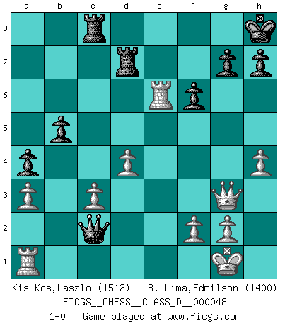 Last move : 1-0 2007 July 5 0:24:18 [Event "FICGS__CHESS__CLASS_D__000048"] [Site "FICGS"] [Date "2007.05.28"] [Round "1"] [White "Kis-Kos,Laszlo"] [Black "B. Lima,Edmilson"] [Result "1-0"] [WhiteElo "1512"] [BlackElo "1400"] 1.e4 c6 2.d4 d5 3.exd5 cxd5 4.c4 Nf6 5.Nc3 e6 6.Nf3 Be7 7.cxd5 Nxd5 8.Bd3 Nc6 9.O-O O-O 10.Re1 Bf6 11.Be4 Nce7 12.h4 Nf5 13.Qd3 Nb4 14.Qc4 a5 15.a3 Nd6 16.Qb3 Nxe4 17.Nxe4 Nd5 18.Nxf6+ Qxf6 19.Bg5 Qf5 20.Ne5 a4 21.Qg3 Kh8 22.Nc4 f6 23.Bd2 b5 24.Nd6 Qc2 25.Bc3 Bd7 26.Ne4 Nxc3 27.bxc3 Rac8 28.Nc5 Rf7 29.Nxd7 Rxd7 30.Rxe6 1-0 Caro-Kann : Panov-Botvinnik attack, 5...e6 Kingside Castling by player White (move 9) Kingside Castling by player Black (move 9) Player White won this chess game. Follow this game move after move (download)Castle early and often. (Rob Sillars) Ich bewundere Kasparows phantasievolle Angriffssiege aus den Achtzigern und Neunzigern, aber wenn man sie mit dem Computer überprüft, nimmt der Computer in jeder zweiten Partie die Opfer an, verteidigt sich und gewinnt. (Vladimir Kramnik) Repentinamente, me resultaba obvio en mi analisis que yo había pasado por alto lo que Fischer había visto en el tablero con la mas grande facilidad. (Mikhail Botvinnik) Un journaliste : 'Vous préférez avoir une dame de plus sur l'échiquier ou au lit ?' Boris Spassky : 'Ca dépend de la position.' Animated gif is worth one mega-word. (Unknown)
