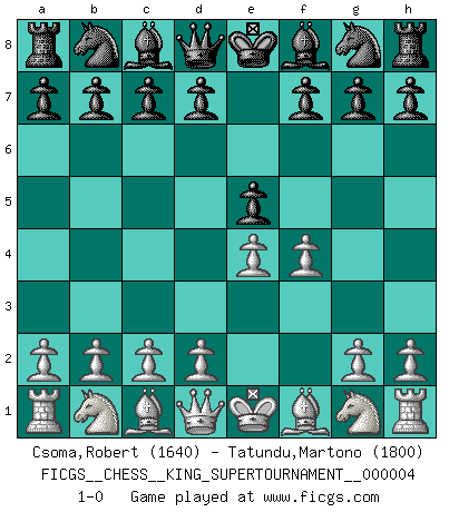 Last move : 1-0 2019 January 15 17:59:11 [Event "FICGS__CHESS__KING_SUPERTOURNAMENT__000004"] [Site "FICGS"] [Date "2018.12.16"] [Round "1"] [White "Csoma,Robert"] [Black "Tatundu,Martono"] [Result "1-0"] [WhiteElo "1640"] [BlackElo "1800"] 1.e4 e5 2.f4 1-0 This chess game has been lost on time (started : 2018.12.16 15:42:43) King's gambit Player White won this chess game. Follow this game move after move (download)We cannot resist the fascination of sacrifice, since a passion for sacrifices is part of a Chessplayer's nature. (Rudolf Spielman) Es ist wirklich schade, dass so viele Schachspieler nicht auf ihr Äußeres achten! (Alexandra Kosteniuk) Coloca el contenido del tablero de Ajedrez en un sombrero, agita las piezas vigorosamente, derrámalas en el tablero desde una altura de medio metro y así obtienes el estilo de Wilhelm Steinitz. (H. E. Bird) On a dit que l'homme se distingue de l'animal par le fait qu'il achète plus de livres qu'il ne peut en lire. Je voudrais suggérer qu'inclure à la liste des livres quelques livres d'échecs rendrait la distinction manifeste. (Edward Lasker) Think like a man of action, act like a man of thought. (Henri Louis Bergson)