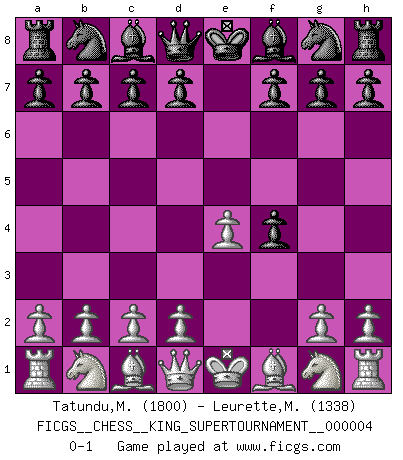 Last move : 0-1 2019 January 16 5:58:55 [Event "FICGS__CHESS__KING_SUPERTOURNAMENT__000004"] [Site "FICGS"] [Date "2018.12.16"] [Round "1"] [White "Tatundu,Martono"] [Black "Leurette,Marc-Antoine"] [Result "0-1"] [WhiteElo "1800"] [BlackElo "1338"] 1.e4 e5 2.f4 exf4 0-1 This chess game has been lost on time (started : 2018.12.16 15:42:43) King's gambit accepted Player Black won this chess game. Follow this game move after move (download)Fischer Chess play was always razor-sharp, rational and brilliant. One of the best ever. (Dave Regis) Verschiedene, sehr schätzbare und im Laufe des Lebens nützliche Eigenschaften des Geistes können durch das Schachspiel erworben und gekräftigt werden, so dass sie zu Gewohnheiten werden, die uns nie im Stich lassen. (Benjamin Franklin) El Ajedrez es una hermosa aventura. (Bent Larsen) Tous ces prétendus hommes politiques sont les pions, les Cavaliers, les Tours ou les Fous d'une partie d'échecs qui se jouera tant qu'un hasard ne renversera pas l'échiquier. (Honoré de Balzac) The ego is not master in its own house. (Sigmund Freud)