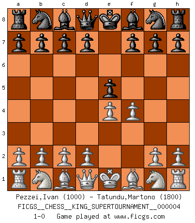 Last move : 1-0 2019 January 15 17:59:11 [Event "FICGS__CHESS__KING_SUPERTOURNAMENT__000004"] [Site "FICGS"] [Date "2018.12.16"] [Round "1"] [White "Pezzei,Ivan"] [Black "Tatundu,Martono"] [Result "1-0"] [WhiteElo "1000"] [BlackElo "1800"] 1.e4 e5 2.f4 1-0 This chess game has been lost on time (started : 2018.12.16 15:42:43) King's gambit Player White won this chess game. Follow this game move after move (download)Chess is played with the mind and not with the hands ! (Renaud and Kahn) Mein Name ist Rustam Kamsky. Sie haben meinen Sohn belästigt. Bereiten Sie sich aufs Sterben vor. (Rustam Kamsky) El Ajedrez hace al hombre ser mas sabio y ver mas claro. (Vladimir Putin) Aux échecs, les retours au sommet sont rares : les dommages psychologiques consécutifs à une défaite sont trop sévères. (Daily Telegraph) Don't be irreplaceable, if you can't be replaced, you can't be promoted. (Dan Rotaru)