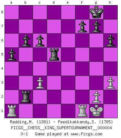 Last move : 0-1 2019 March 21 14:30:46 [Event "FICGS__CHESS__KING_SUPERTOURNAMENT__000004"] [Site "FICGS"] [Date "2018.12.16"] [Round "1"] [White "Radding,Marvin"] [Black "Peedikakkandy,Sameer"] [Result "0-1"] [WhiteElo "1381"] [BlackElo "1785"] 1.e4 e5 2.f4 d5 3.exd5 exf4 4.Nf3 Qxd5 5.Nc3 Qe6+ 6.Qe2 Bd6 7.Qxe6+ Bxe6 8.d4 c6 9.Bd3 h6 10.O-O Nf6 11.Bd2 O-O 12.Rad1 Re8 13.Ne4 Nxe4 14.Bxe4 Nd7 15.Ne5 Nxe5 16.dxe5 Bxe5 17.c3 Rad8 18.Rf2 Rd7 19.Re1 Red8 20.Bxf4 Bxf4 21.Rxf4 Bxa2 22.Bc2 Be6 23.Ref1 a5 24.Ra4 b6 25.R4a1 Rd2 26.Be4 Bd5 27.Bxd5 R8xd5 28.h3 Rxb2 0-1 KGD : Falkbeer counter-gambit Kingside Castling by player White (move 10) Kingside Castling by player Black (move 11) Player Black won this chess game. Follow this game move after move (download)Chess is above all, a fight ! (Emanuel Lasker) Ein bischen Romantik kann weder im Schach noch in der Liebe schaden. Also versuche ich mich ab und zu daran zu erinnern. (Nigel Short) Aquellos que dicen entender al Ajedrez, no entienden nada. (Robert Hubner) Ce qui caractérise les parties de combat, c'est que si le défenseur a constamment de difficiles problèmes à résoudre, l'attaquant doit chercher sans relâche de nouvelles possibilités d'attaque. (Koblentz) I've lost money so fast in these clubs it's left me reeling. I've read every poker book ever written, but the only way to get better at the game is to go out and play with people who are really good. The problem is, you stand to lose a lot of money doing it. (Matt Damon)