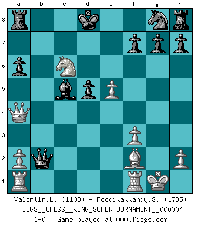 Last move : 1-0 2019 January 30 16:22:55 [Event "FICGS__CHESS__KING_SUPERTOURNAMENT__000004"] [Site "FICGS"] [Date "2018.12.16"] [Round "1"] [White "Valentin,Laurentiu"] [Black "Peedikakkandy,Sameer"] [Result "1-0"] [WhiteElo "1109"] [BlackElo "1785"] 1.e4 e5 2.f4 exf4 3.Nf3 Nc6 4.d4 d5 5.e5 Bg4 6.Bxf4 Bxf3 7.gxf3 Qh4+ 8.Bg3 Qd8 9.Bb5 a6 10.Bxc6+ bxc6 11.O-O c5 12.c3 cxd4 13.cxd4 c5 14.Nc3 cxd4 15.Ne2 Qb6 16.Nxd4 Bc5 17.Bf2 Qxb2 18.Qa4+ Kd8 19.Nc6+ 1-0 King's knight's gambit Kingside Castling by player White (move 11) Player White won this chess game. Follow this game move after move (download)Live, lose, and learn, by observing your opponent how to win. (Amber Steenbock) Wie ich sie so einen nach dem anderen nieder mähte wurde meine Überlegenheit offensichtlich. (José Raúl Capablanca) Vive, pierde y aprende al observar a tu oponente como ganar. (Amber Steenbock) Il vaut mieux sacrifier les pièces de l'adversaire. (Xavier Tartacover) May I never be complete. May I never be content. May I never be perfect. Deliver me, Tyler, from being perfect and complete. (Chuck Palahniuk, Fight Club)