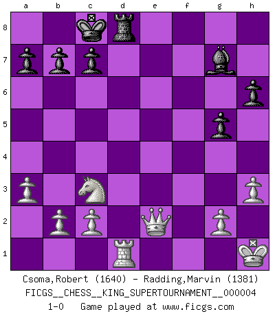 Last move : 1-0 2019 January 28 16:3:21 [Event "FICGS__CHESS__KING_SUPERTOURNAMENT__000004"] [Site "FICGS"] [Date "2018.12.16"] [Round "1"] [White "Csoma,Robert"] [Black "Radding,Marvin"] [Result "1-0"] [WhiteElo "1640"] [BlackElo "1381"] 1.e4 e5 2.f4 exf4 3.Nf3 d6 4.d4 Nf6 5.Nc3 Bg4 6.Bxf4 Nc6 7.Be2 Qd7 8.h3 Bxf3 9.Bxf3 O-O-O 10.O-O h6 11.a3 g5 12.Bg3 Bg7 13.e5 dxe5 14.dxe5 Nh7 15.Bxc6 Qxc6 16.Qe2 Rhe8 17.Rxf7 Rg8 18.e6 Qc5+ 19.Kh1 Rd6 20.e7 Nf6 21.Bxd6 Qxd6 22.Rxf6 Qxf6 23.e8Q+ Qd8 24.Qxd8+ Rxd8 25.Rd1 1-0 KGA : Fischer defense Queenside Castling by player Black (move 9) Kingside Castling by player White (move 10) Promotion Queen by player White (move 23) Player White won this chess game. Follow this game move after move (download)I prefer to lose a really good game than to win a bad one. (David Levy) Die Partien sind immer verschieden, die Interviews immer die gleichen. (Garry Kasparov) El hombre es un frívolo, una creatura engañosa y como un jugador de Ajedrez, se preocupa mas por el proceso de obtener su meta que de la meta por sí misma. (Dostoyevsky) Mon pion favori sur ma case favorite ! Bronstein en parlant d'un coup de pion en h5 quand il avait les Noirs. Ah, the Socrating method. The best way we have of teaching everything-apart from juggling chainsaws. (Gregory House, House M.D.)