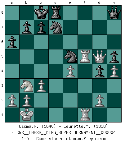 Last move : 1-0 2019 January 9 9:34:49 [Event "FICGS__CHESS__KING_SUPERTOURNAMENT__000004"] [Site "FICGS"] [Date "2018.12.16"] [Round "1"] [White "Csoma,Robert"] [Black "Leurette,Marc-Antoine"] [Result "1-0"] [WhiteElo "1640"] [BlackElo "1338"] 1.e4 e5 2.f4 exf4 3.Nf3 g5 4.Bc4 Bg7 5.h4 g4 6.Ng5 Qf6 7.Nxf7 d6 8.Nc3 Be6 9.Bxe6 Qxe6 10.Nxh8 Bxh8 11.Qe2 Nc6 12.Nb5 Qd7 13.d3 a6 14.Na3 O-O-O 15.c3 Nf6 16.Bxf4 h5 17.O-O-O Qe6 18.Kb1 Nd7 19.Bg5 Bf6 20.Bxf6 Nxf6 21.Rhf1 d5 22.Rde1 dxe4 23.dxe4 Ne5 24.Nc2 Nfd7 25.Rf5 Nf6 26.Nd4 Qb6 27.Ref1 Nfd7 28.Nb3 Qh6 29.Qd2 Qh8 30.Qg5 1-0 KGA : Philidor gambit Queenside Castling by player Black (move 14) Queenside Castling by player White (move 17) Player White won this chess game. Follow this game move after move (download)Fischer prefers to enter Chess history alone. (Miguel Najdorf) Ich möchte Schüler heranbilden, die das Vermögen haben, selbst zu denken und Kritik zu üben. (Emanuel Lasker) Los problemas de Ajedrez exigen del compositor las mismas virtudes que caracterizan todo el arte de valor: originalidad, invención, concisión, armonía, complejidad e insinceridad explendida. (Vladimir Nabokov) On est toujours la mazette de quelqu'un d'autre. (Anonyme) Luck has a peculiar habit of favoring those who don't depend on it. (Author unknown)