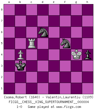 Last move : 1-0 2019 April 27 18:41:39 [Event "FICGS__CHESS__KING_SUPERTOURNAMENT__000004"] [Site "FICGS"] [Date "2018.12.16"] [Round "1"] [White "Csoma,Robert"] [Black "Valentin,Laurentiu"] [Result "1-0"] [WhiteElo "1640"] [BlackElo "1109"] 1.e4 e5 2.f4 exf4 3.a4 Be7 4.Nf3 Bh4+ 5.Ke2 Nc6 6.c3 d6 7.d4 Bg4 8.Bxf4 Qf6 9.Be3 O-O-O 10.h3 Bxf3+ 11.gxf3 Nge7 12.Nd2 Ng6 13.Qc2 Bg5 14.Bxg5 Qxg5 15.Qd3 Rhe8 16.Kd1 f5 17.Kc2 fxe4 18.fxe4 Nf4 19.Qf3 Rf8 20.Qg4+ Qxg4 21.hxg4 h6 22.Bc4 Ng2 23.Be6+ Kb8 24.Rhg1 Nf4 25.Bc4 Rde8 26.a5 a6 27.b4 Nh3 28.Rgf1 Ng5 29.Bd5 Ne7 30.Bc4 Ng6 31.b5 axb5 32.Bxb5 c6 33.Bd3 Nf4 34.a6 Nxd3 35.a7+ Ka8 36.Rxf8 Rxf8 37.Nc4 b5 38.Nb6+ Kb7 39.a8Q+ Rxa8 40.Nxa8 Nf2 41.e5 dxe5 42.dxe5 Nxg4 43.e6 Nxe6 44.Re1 Nc5 45.Re7+ Kxa8 46.Rxg7 Ne3+ 47.Kd2 Nf5 48.Rf7 Ne4+ 49.Kd3 Ned6 50.Rc7 Nc4 51.Ke4 Ncd6+ 52.Ke5 Kb8 53.Rxc6 h5 54.Kf4 h4 55.Kg4 Kb7 56.Rc5 Kb6 57.Re5 Ka5 58.Re1 Ka4 59.Re5 Kb3 60.Rc5 b4 61.cxb4 1-0 This chess game has been lost on time (started : 2018.12.16 15:42:43) King's gambit accepted Queenside Castling by player Black (move 9) Promotion Queen by player White (move 39) 10 pieces endgame at move 45 : White KRP , Black KNNPPPP WHITE : King + 1 Rook 1 Pawn BLACK : King + 2 Knights 4 Pawns 9 pieces endgame at move 46 : White KRP , Black KNNPPP WHITE : King + 1 Rook 1 Pawn BLACK : King + 2 Knights 3 Pawns 8 pieces endgame at move 53 : White KRP , Black KNNPP WHITE : King + 1 Rook 1 Pawn BLACK : King + 2 Knights 2 Pawns 7 pieces endgame at move 61 : White KRP , Black KNNP WHITE : King + 1 Rook 1 Pawn BLACK : King + 2 Knights 1 Pawn Player White won this chess game. Follow this game move after move (download)I love all positions. Give me a difficult positional game, I will play it. But totally won positions, I cannot stand them. (Hein Donner) Sehr viele beherrschen heutzutage das große Einmalseins des Schachspiels und kennen sogar dessen Logarithmentafeln auswendig - deshalb sollte man hin und wieder zu beweisen trachten, dass zwei mal zwei auch fünf sein kann. (Mikhail Nekhemyevich Tal) El sobresalir en el Ajedrez es un signo de una mente intrigante. (Sir Arthur Conan Doyle) D'abord les bases : Jouez et étudiez, puis étudiez et jouez, ensuite jouez et étudiez, puis étudiez et jouez. Deuxièmement : Donnez toujours le meilleur de vous-même ! (Ken Smith) Methinks King Thibault should dub Marius Zubac a knight of the square board... I mean table, henceforth addressing him as Sir Marius, and bestow on him a suitable land from the kingdom of FICGS & marry him off to a worthy, fair maiden, lest he slice our heads with his mighty sword in his wrath. (Dinesh De Silva)