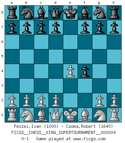 Last move : 0-1 2019 January 16 5:58:55 [Event "FICGS__CHESS__KING_SUPERTOURNAMENT__000004"] [Site "FICGS"] [Date "2018.12.16"] [Round "1"] [White "Pezzei,Ivan"] [Black "Csoma,Robert"] [Result "0-1"] [WhiteElo "1000"] [BlackElo "1640"] 1.e4 e5 2.f4 exf4 0-1 This chess game has been lost on time (started : 2018.12.16 15:42:43) King's gambit accepted Player Black won this chess game. Follow this game move after move (download)When I have White, I win because I am white; When I have Black, I win because I am Bogolyubov. (Bogolyubov) Die westlichen Werte sind eine Sprache, welche die Putin-Administration nicht versteht. (Garry Kasparov) Todos los jugadores de Ajedrez deberían tener un pasatiempo. (Savielly Tartakower) Les Echecs sont et restent toujours un combat, un combat intégral comme la boxe, la lutte ou un autre sport, et où il doit y avoir un vainqueur et un vaincu. (Joseph Emil Diemer) CHESS, n. f. [echecs, Fr.] A nice and abstruse game, in which two sets of puppets are moved in opposition to each other. (Dr Samuel Johnson, A Dictionary Of The English Language, 1755)