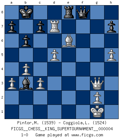 Last move : 1-0 2019 January 29 0:9:33 [Event "FICGS__CHESS__KING_SUPERTOURNAMENT__000004"] [Site "FICGS"] [Date "2018.12.16"] [Round "1"] [White "Pintor,Manuel"] [Black "Coggiola,Leandro Damian"] [Result "1-0"] [WhiteElo "1539"] [BlackElo "1524"] 1.e4 e5 2.f4 exf4 3.Nf3 g5 4.Bc4 g4 5.O-O gxf3 6.Qxf3 Nc6 7.c3 d6 8.Qh5 Ne5 9.Bb3 Nf6 10.Qh4 Be7 11.Qxf4 Ng6 12.Qf3 Be6 13.Ba4+ Bd7 14.Bb3 Be6 15.Bc2 Qd7 16.d4 O-O-O 17.Bg5 Bg4 18.Qe3 Ng8 19.Rxf7 Rf8 20.Rxf8+ Nxf8 21.Nd2 Ne6 22.Bxe7 Nxe7 23.Rf1 Bh5 24.e5 Bg6 25.Bd1 dxe5 26.Qxe5 Re8 27.Bg4 Nc6 28.Qe3 Ncd8 29.Nf3 Qc6 30.Ne5 Qd6 31.h4 Nc6 32.h5 Bc2 33.Nf7 Qd5 34.Rf6 Ncd8 35.Nxd8 Qxd8 36.Bxe6+ Kb8 37.Rf7 Qd6 38.d5 b6 39.b4 Ba4 40.a3 Bb3 41.Rd7 Qf8 42.Qg3 1-0 KGA : Muzio gambit, Holloway defense Kingside Castling by player White (move 5) Queenside Castling by player Black (move 16) Player White won this chess game. Follow this game move after move (download)War is the child of passion, passion is the child of narcissism and narcissism is the child. (...) Another game ? (Thibault de Vassal) Mein Gehirn das ist mein zweitwichtigstes Organ [Aus dem Film: Der Schläfer]. (Woody Allen) El tablero es el mundo, las piezas es el fenomeno del universo, las reglas del juego son lo que llamamos leyes de la naturaleza y el jugador del lado opuesto, se encuentra oculto a nuestra vista. (Thomas Huxley) Les échecs, c'est la lutte contre l'erreur. (Johannes Zukertort) Your best chance to get a Royal Flush in a casino is in the bathroom. (Anonymous)