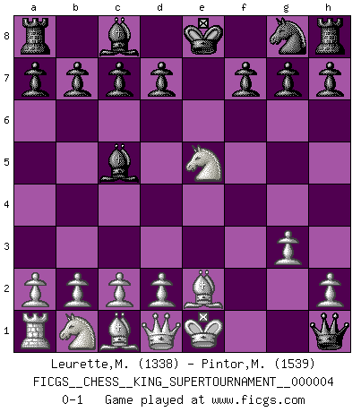 Last move : 0-1 2018 December 18 20:33:22 [Event "FICGS__CHESS__KING_SUPERTOURNAMENT__000004"] [Site "FICGS"] [Date "2018.12.16"] [Round "1"] [White "Leurette,Marc-Antoine"] [Black "Pintor,Manuel"] [Result "0-1"] [WhiteElo "1338"] [BlackElo "1539"] 1.e4 e5 2.f4 Nc6 3.Nf3 Bc5 4.fxe5 Nxe5 5.Nxe5 Qh4+ 6.g3 Qxe4+ 7.Be2 Qxh1+ 0-1 King's gambit Player Black won this chess game. Follow this game move after move (download)Of Chess it has been said that life is not long enough for it, but that is the fault of life, not Chess. (William Ewart Napier) In der Schule lernt man nichts. Es ist nur Zeitverschwendung. (Robert James Fischer) Un mal plan es mejor que no tener ningún plan. (Frank Marshall) Toutes choses étant égales, c'est la conviction qui gagne. Alliée à une volonté de vaincre, elle sert de détonateur, suscite des idées, disperse les doutes et aide à penser clairement. (Robert Fischer) In my experience, there's no such thing as luck. (Obi-Wan Kenobi in Star Wars ep.4)