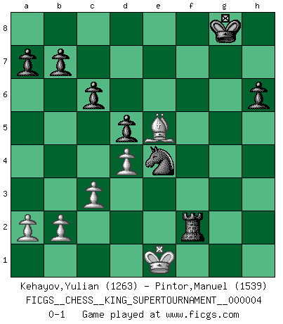 Last move : 0-1 2019 February 23 9:14:45 [Event "FICGS__CHESS__KING_SUPERTOURNAMENT__000004"] [Site "FICGS"] [Date "2018.12.16"] [Round "1"] [White "Kehayov,Yulian"] [Black "Pintor,Manuel"] [Result "0-1"] [WhiteElo "1263"] [BlackElo "1539"] 1.e4 e5 2.f4 Nc6 3.fxe5 Qh4+ 4.g3 Qxe4+ 5.Qe2 Qxh1 6.Nf3 Bc5 7.Qg2 Qxg2 8.Bxg2 Bd4 9.Nxd4 Nxd4 10.Be4 f5 11.Bd3 Nh6 12.c3 Nf3+ 13.Kf2 Nxe5 14.Be2 Nhg4+ 15.Kg2 d5 16.d4 Nc4 17.Nd2 Nce3+ 18.Kg1 O-O 19.Nf1 Nxf1 20.Bxf1 h6 21.h3 Nf6 22.Bg2 c6 23.Bf4 Ne4 24.Rc1 g5 25.Be5 f4 26.gxf4 gxf4 27.Rf1 f3 28.Bxf3 Bxh3 29.Bg2 Rxf1+ 30.Bxf1 Bxf1 31.Kxf1 Rf8+ 32.Ke1 Rf2 0-1 This chess game has been lost on time (started : 2018.12.16 15:42:43) King's gambit Kingside Castling by player Black (move 18) Player Black won this chess game. Follow this game move after move (download)Is Bobby Fischer quite sane ? (Salo Flohr) Die Arbeit ist etwas Unnatürliches. Die Faulheit allein ist göttlich. (Anatole France) En la vida, como en el Ajedrez, los Peones propios obstruyen nuestro camino. La gran fortuna de un hombre, su comodidad, placer, hijos, libros, que deberían ayudarle a ganar, con mucha frecuencia lo ponen en Jaque Mate. (Charles Buxton) Même si l'adversaire joue le coup analysé précédemment, recommencez l'analyse en voyant la nouvelle position. Première règle de Blumenfeld We cannot be sure of having something to live for unless we are willing to die for it. (Ernesto Che Guevara)