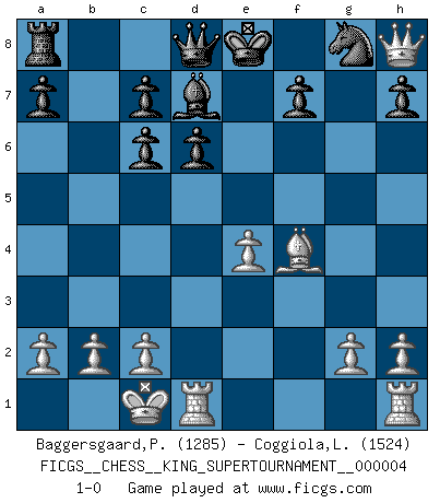 Last move : 1-0 2018 December 26 17:57:19 [Event "FICGS__CHESS__KING_SUPERTOURNAMENT__000004"] [Site "FICGS"] [Date "2018.12.16"] [Round "1"] [White "Baggersgaard,Poulerik"] [Black "Coggiola,Leandro Damian"] [Result "1-0"] [WhiteElo "1285"] [BlackElo "1524"] 1.e4 e5 2.f4 exf4 3.Nf3 g5 4.Nc3 Bg7 5.d4 g4 6.Bxf4 gxf3 7.Qxf3 Nc6 8.O-O-O d6 9.Qg3 Bxd4 10.Bb5 Bxc3 11.Bxc6+ bxc6 12.Qxc3 Bd7 13.Qxh8 1-0 KGA : Quaade gambit Queenside Castling by player White (move 8) Player White won this chess game. Follow this game move after move (download)Is Bobby Fischer quite sane ? (Salo Flohr) Ein Kibitz ist einer, der deinem Gegner gute Ratschläge gibt. (Andrew Soltis) Una buena ofensiva y una buena defensa, comienzan ambas con un buen desarrollo. (Bruce A. Moon) Mon pion favori sur ma case favorite ! Bronstein en parlant d'un coup de pion en h5 quand il avait les Noirs. Art is the only way to run away without leaving home. (Twyla Tharp)