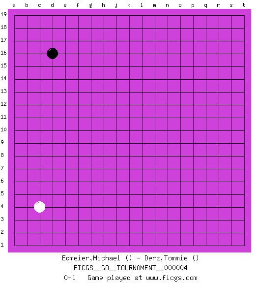 Last move : 0-1 2006 August 6 15:59:13 [Event "FICGS__GO__TOURNAMENT__000004"] [Site "FICGS"] [Date "2006.06.08"] [Round "1"] [Black "Edmeier,Michael"] [White "Derz,Tommie"] [Result "0-1"] 1.d16 c4 0-1 This go game has been lost on time (started : 2006.06.08 14:53:11) Here are the names of the openings (joseki) played in the four corners : Corner d4 : c4 0-1 Komoku (Somok, Xiao~mu`) 3-4 Point. The komoku (3-4) point is the traditional corner enclosure move.. Player White won this Go (weiqi, baduk) game. Follow this game move after move (download)Keep inessential ataris till the end. (Anonymous) Secret operations are essential in war; upon them the army relies to make its every move. (Sun Tzu)