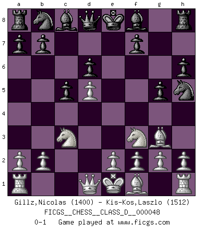 Last move : 0-1 2007 July 12 10:43:50 [Event "FICGS__CHESS__CLASS_D__000048"] [Site "FICGS"] [Date "2007.05.28"] [Round "1"] [White "Gillz,Nicolas"] [Black "Kis-Kos,Laszlo"] [Result "0-1"] [WhiteElo "1400"] [BlackElo "1512"] 1.d4 Nf6 2.c4 c5 3.d5 e6 4.Nc3 exd5 5.cxd5 d6 6.Nf3 g6 7.Bg5 h6 8.Bh4 g5 9.Bg3 Nh5 0-1 This chess game has been lost on time (started : 2007.05.28 8:40:6) Benoni : Uhlmann variation Player Black won this chess game. Follow this game move after move (download)Checkers is for tramps. (Paul Morphy) Weshalb minderdergeübte Spieler mit g2-g4 beginnen? Die betreffenden sind unschlüssig, ob sie nun rechts (h4) oder links (f4) beginnen sollen, und in ihrer Ratlosigkeit entschliessen sie sich nach guter Bürgerart dazu, den goldenen Mittelweg zu wählen. (Aaron Nimzowitsch) El Ajedrez es sobre todo, ¡una pelea!. (Emanuel Lasker) Psychologiquement, tu dois avoir confiance en toi même, mais cette confiance doit être basée sur des faits. (Robert Fischer) Faith : not wanting to know what is true. (Friedrich Nietzsche)