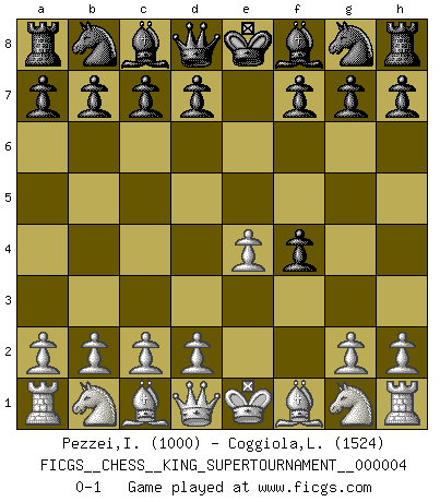 Last move : 0-1 2019 January 15 17:56:3 [Event "FICGS__CHESS__KING_SUPERTOURNAMENT__000004"] [Site "FICGS"] [Date "2018.12.16"] [Round "1"] [White "Pezzei,Ivan"] [Black "Coggiola,Leandro Damian"] [Result "0-1"] [WhiteElo "1000"] [BlackElo "1524"] 1.e4 e5 2.f4 exf4 0-1 This chess game has been lost on time (started : 2018.12.16 15:42:43) King's gambit accepted Player Black won this chess game. Follow this game move after move (download)Every Chess master was once a beginner. (Chernev) Mein erstes Ziel war nicht, die Partie zu gewinnen, sondern eine Figur zu opfern. -- der junge (Wilhelm Steinitz) No hay otro maestro que tenga una voluntad terrífica de ganar. Al tablero, el irradía peligro y aún los oponentes mas fuertes tienden a congelarse como liebres cuando olfatean a una pantera. Aún sus debilidades son peligrosas. Con las blancas, su juego de apertura es predecible - te es posible hacer planes en su contra - pero es tan fuerte que tus planes casi nunca funcionan. En el juego medio, su precisión e invención son fabulosas y en finales, tú simplemente no le puedes vencer. (Experto Alemán anónimo) Votre seul travail dans les ouvertures est d'obtenir un milieu de partie jouable. (Lajos Portish) Quotation,n.: The act of repeating erroneously the words of another. The words erroneously repeated. (Ambrose Bierce, The Devil's Dictionary)