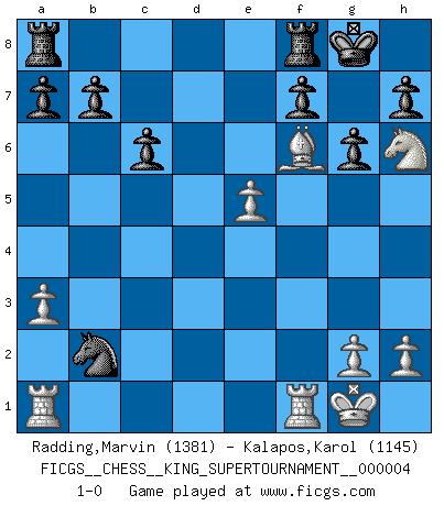 Last move : 1-0 2019 February 25 4:26:7 [Event "FICGS__CHESS__KING_SUPERTOURNAMENT__000004"] [Site "FICGS"] [Date "2018.12.16"] [Round "1"] [White "Radding,Marvin"] [Black "Kalapos,Karol"] [Result "1-0"] [WhiteElo "1381"] [BlackElo "1145"] 1.e4 e5 2.f4 d5 3.exd5 Qxd5 4.fxe5 Qxe5+ 5.Qe2 Bd6 6.Nf3 Qxe2+ 7.Bxe2 Bd7 8.Nc3 Nf6 9.d4 c6 10.O-O O-O 11.Bg5 Nh5 12.Ne4 Bc7 13.Ne5 Bxe5 14.dxe5 g6 15.Bxh5 Bf5 16.Nd6 Bxc2 17.Bf3 Na6 18.Be4 Nb4 19.a3 Bxe4 20.Nxe4 Nd3 21.Nf6+ Kg7 22.Ng4 Nxb2 23.Bf6+ Kg8 24.Nh6+ 1-0 KGD : Falkbeer counter-gambit Kingside Castling by player White (move 10) Kingside Castling by player Black (move 10) Player White won this chess game. Follow this game move after move (download)The Pin is mightier than the sword. (Fred Reinfeld) Wer nie einen Fehler gemacht hat, hat nie etwas Neues ausprobiert. (Albert Einstein) Las Aperturas te enseñan aperturas. ¡Los Finales te enseñan Ajedrez!. (Stephan Gerzadowicz) Les échecs sont un jeu par leur forme, un art par leur essence et une science par sa difficulté d'acquisition. Ils peuvent vous procurer autant de plaisir qu'un bon livre ou une belle musique, mais vous n'aurez une réelle joie que si vous arrivez à bien jouer. (Tigran Petrosian) The man who strikes first admits that his ideas have given out. (Chinese proverb)