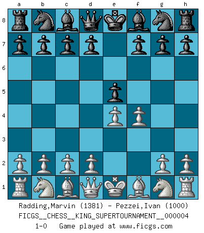 Last move : 1-0 2019 January 15 17:59:11 [Event "FICGS__CHESS__KING_SUPERTOURNAMENT__000004"] [Site "FICGS"] [Date "2018.12.16"] [Round "1"] [White "Radding,Marvin"] [Black "Pezzei,Ivan"] [Result "1-0"] [WhiteElo "1381"] [BlackElo "1000"] 1.e4 e5 2.f4 1-0 This chess game has been lost on time (started : 2018.12.16 15:42:43) King's gambit Player White won this chess game. Follow this game move after move (download)Nowadays, when you're not a grandmaster at 14, you can forget about it. (Anand Viswanathan) Die Elozahlen sind sehr schlecht für das Schach. Jetzt ist Schach eine Sportindustrie, die darauf zielt Elopunkte zu machen. (Miguel Najdorf) Haz el enroque temprano y seguido. (Rob Sillars) On n'a jamais que l'âge auquel on a commence à jouer aux échecs car après on cesse de vieillir. (Capablanca) May the force be with you. (Han Solo in Star Wars ep.4)