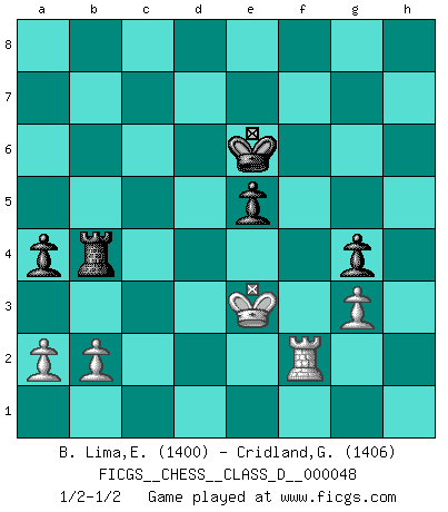 Last move : 1/2-1/2 2007 August 1 0:7:0 [Event "FICGS__CHESS__CLASS_D__000048"] [Site "FICGS"] [Date "2007.05.28"] [Round "1"] [White "B. Lima,Edmilson"] [Black "Cridland,Graham"] [Result "1/2-1/2"] [WhiteElo "1400"] [BlackElo "1406"] 1.d4 Nf6 2.Bg5 d5 3.Nc3 e6 4.e4 dxe4 5.Nxe4 Nbd7 6.Nf3 Be7 7.Nxf6+ Bxf6 8.Bxf6 Nxf6 9.Bd3 Bd7 10.O-O O-O 11.Ne5 Rc8 12.c4 c5 13.dxc5 Rxc5 14.Re1 Qc7 15.Qe2 a5 16.Rad1 Rd8 17.Qe3 Be8 18.Rd2 b5 19.f4 g6 20.cxb5 Nd5 21.Qf2 Bxb5 22.Bxb5 Rxb5 23.Rc2 Qb6 24.Nc6 Qxf2+ 25.Kxf2 Nb4 26.Nxb4 Rxb4 27.Kf3 Rd3+ 28.Re3 Rd1 29.g3 Kg7 30.Re5 a4 31.Re4 Rf1+ 32.Ke2 Rxe4+ 33.Kxf1 Kf6 34.Kg2 h5 35.Kf3 Rb4 36.Ke3 Kf5 37.h3 f6 38.Rc5+ e5 39.Ra5 g5 40.fxe5 fxe5 41.Ra8 g4 42.Rf8+ Ke6 43.hxg4 hxg4 44.Rf2 1/2-1/2 Trompowsky attack (Ruth, Opovcensky Opening) Kingside Castling by player White (move 10) Kingside Castling by player Black (move 10) 10 pieces endgame at move 43 : White KRPPP , Black KRPPP WHITE : King + 1 Rook 3 Pawns BLACK : King + 1 Rook 3 Pawns This chess game ended in a draw. Follow this game move after move (download)Chess is so inspiring that I do not believe a good player is capable of having an evil thought during the game. (Wilhelm Steinitz) Matt entspricht nicht immer den Tatsachen. (Savielly Grigorievitsch Tartakower) Preferería tener un Peón que un dedo. (Reuben Fine) Il vaut toujours mieux jouer un plan faux de façon logique que de n'avoir pas de plan du tout. (Victor Kortchnoï) When it is a question of money, everybody is of the same religion. (Voltaire)