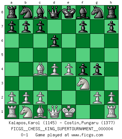 Last move : 0-1 2019 January 20 6:40:28 [Event "FICGS__CHESS__KING_SUPERTOURNAMENT__000004"] [Site "FICGS"] [Date "2018.12.16"] [Round "1"] [White "Kalapos,Karol"] [Black "Costin,Pungaru"] [Result "0-1"] [WhiteElo "1145"] [BlackElo "1377"] 1.e4 e5 2.f4 d6 3.Nf3 exf4 4.d4 g5 5.Bc4 g4 0-1 This chess game has been lost on time (started : 2018.12.16 15:42:43) King's gambit Player Black won this chess game. Follow this game move after move (download)A player surprised is half beaten. (Proverb) Im Schach gibt es keinen Platz für Galanterie. (Irving Chernev) El poder defensivo de una pieza clavada, solamente es imaginario. (Aaron Nimzovich) L'action d'une oeuvre littéraire se déroule sur un champ de bataille. Les masques et les types du drame moderne correspondent aux pièces du jeu d'échecs. L'intrigue correspond aux coups et aux gambits, c'est à dire aux techniques du jeu telles qu'utilisées et interprétées par les joueurs. Les tactiques et les péripéties [mouvements] correspondent aux coups exécutés par l'adversaire. (Viktor Shklovsky) The mind is like a parachute, it only functions when its open. (Unknown)