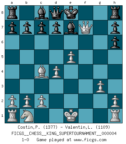 Last move : 1-0 2018 December 25 11:40:32 [Event "FICGS__CHESS__KING_SUPERTOURNAMENT__000004"] [Site "FICGS"] [Date "2018.12.16"] [Round "1"] [White "Costin,Pungaru"] [Black "Valentin,Laurentiu"] [Result "1-0"] [WhiteElo "1377"] [BlackElo "1109"] 1.e4 e5 2.f4 Nc6 3.fxe5 Nxe5 4.Nf3 Nxf3+ 5.Qxf3 Be7 6.Bc4 Nh6 7.d4 Bh4+ 8.g3 Bf6 9.e5 Be7 10.Bxh6 gxh6 11.Qxf7+ 1-0 King's gambit Player White won this chess game. Follow this game move after move (download)A win by an unsound combination, however showy, fills me with artistic horror. (Wilhelm Steinitz) Der Umstand, daß uns eine 7 Stunden Zeitkontrolle ermöglicht eine großartige, tiefe Partie zu spielen, ist für die Massenmedien nicht weiter von Bedeutung. (Alexej Shirov) El Ajedrez es el arte del análisis. (Mikhail Botvinnik) Le joueur d'Echecs qui veut atteindre le top est obligé de développer son propre credo créatif. Alexeï Stepanovicth Souétine. Il est facile d'écrire des livres ! Ce qui est difficile, c'est de jouer ! (Alexeï Stepanovicth Souétine) The meaning of life is that it is to be lived, and it is not to be traded and conceptualized and squeezed into a pattern of systems. (Bruce Lee)