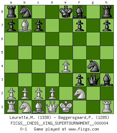 Last move : 0-1 2018 December 26 11:10:14 [Event "FICGS__CHESS__KING_SUPERTOURNAMENT__000004"] [Site "FICGS"] [Date "2018.12.16"] [Round "1"] [White "Leurette,Marc-Antoine"] [Black "Baggersgaard,Poulerik"] [Result "0-1"] [WhiteElo "1338"] [BlackElo "1285"] 1.e4 e5 2.f4 exf4 3.Nf3 g5 4.Bc4 g4 5.Ne5 Qh4+ 6.Kf1 f3 7.g3 Qh3+ 8.Ke1 Qg2 9.Rf1 Qxh2 10.Nxg4 Qxg3+ 11.Nf2 d5 12.Bxd5 Bh3 13.Rh1 Nf6 14.Bxb7 Ng4 0-1 KGA : Cochrane gambit Player Black won this chess game. Follow this game move after move (download)The hardest game to win is a won game. (Emanuel Lasker) Ich bin es gewohnt, das die Jugend mir überhaupt keinen Respekt entgegenbringt. (Alexander Morozewich) Yo no creo en la psicología. Yo creo en las buenas movidas. (Bobby Fischer) Echiquier : carré parfait, comme la Jérusalem nouvelle décrite par l'auteur de l'Apocalypse, huit cases sur huit, exaltation du chiffre 4, symbole du cosmos aux quatre horizons... où le noir et le blanc, l'ombre et la lumière, le mal et le bien s'entremêlent et se conjuguent. (Robert Couffignal, Le Gambit du poète) . 'gn is not allowed in chess unless n is an integer between 1 and 8 inclusive, where 1 and 8 are to interpreted as the standard numerals standing for integers in the ordered real-closed field R, with the *canonical* ordering. (As opposed to, say, an integer in the domain Z[2+i*sqrt(5)] or an integer in some exotic Grothendieck topos). (Normajean Yates)