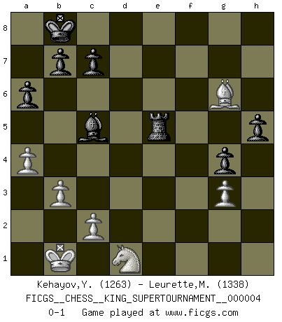Last move : 0-1 2019 February 19 20:49:19 [Event "FICGS__CHESS__KING_SUPERTOURNAMENT__000004"] [Site "FICGS"] [Date "2018.12.16"] [Round "1"] [White "Kehayov,Yulian"] [Black "Leurette,Marc-Antoine"] [Result "0-1"] [WhiteElo "1263"] [BlackElo "1338"] 1.e4 e5 2.f4 exf4 3.Qf3 g5 4.d4 d6 5.Nc3 h6 6.Nge2 Nf6 7.Bd2 Bg4 8.Qf2 Bxe2 9.Bxe2 Nbd7 10.O-O-O a6 11.g3 fxg3 12.hxg3 Qe7 13.Rhe1 O-O-O 14.Bd3 Nb6 15.e5 dxe5 16.Rxe5 Qd6 17.a3 Ng4 18.Qxf7 Nxe5 19.dxe5 Qe7 20.Qxe7 Bxe7 21.Ne4 g4 22.Nf2 h5 23.Bf5+ Kb8 24.Bc3 Nc4 25.Rxd8+ Rxd8 26.a4 Bg5+ 27.Kb1 Re8 28.b3 Nxe5 29.Bxe5 Rxe5 30.Bg6 Be3 31.Nd1 Bc5 0-1 This chess game has been lost on time (started : 2018.12.16 15:42:43) KGA : Breyer gambit Queenside Castling by player White (move 10) Queenside Castling by player Black (move 13) Player Black won this chess game. Follow this game move after move (download)Chess is like war on a board. (Bobby Fischer) Ich verstehe Aljechins Kombinationen ganz gut; aber woher er diese Angriffschancen bekommt und wie er die Eröffnung behandelt das ist für mich ein Buch mit sieben Siegeln. (Rudolf Spielmann) Yo considero que Fischer es uno de los expertos mas grandes de aperturas de siempre. (Keith Hayward) Le plus grand jeu de l'esprit jamais inventé, plus vous l'apprenez, plus vous y prenez du plaisir. (Garry Kasparov) I couldn't make any sense out of what this particular thread is about. It sounds like R2 D2 computer speaking. A space fight ?!? Some 'command' problems in Moscow ? Some killers & narcotic addicts attacking some game & a god wannabe ?? (Dinesh De Silva, lost in a russian conflict in FICGS forum)
