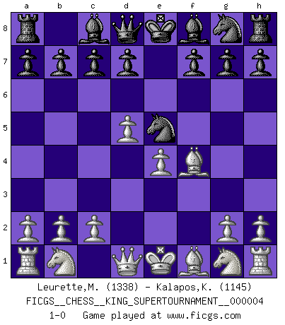 Last move : 1-0 2019 January 20 12:32:11 [Event "FICGS__CHESS__KING_SUPERTOURNAMENT__000004"] [Site "FICGS"] [Date "2018.12.16"] [Round "1"] [White "Leurette,Marc-Antoine"] [Black "Kalapos,Karol"] [Result "1-0"] [WhiteElo "1338"] [BlackElo "1145"] 1.e4 e5 2.f4 Nc6 3.fxe5 Nxe5 4.d4 Nc6 5.d5 Ne5 6.Bf4 1-0 King's gambit Player White won this chess game. Follow this game move after move (download)It is peculiar but a fact nevertheless, that gamblers in chess always have enthusiastic followers. (Botvinnik) Ich verstehe den Grund nicht, warum die Aufteilung in Frauen und Männer überhaupt im Schach besteht. (Judith Polgar) No existe un remordimiento como el remordimiento del Ajedrez. (H. G. Wells) Nous vivons dans un monde échiquéen : chaque jour qui passe est un défi à relever. (Philosophe Sasha) You know what they say : You lie down with the Devil, you wake up in Hell. (Horatio Caine, C.S.I. Miami)