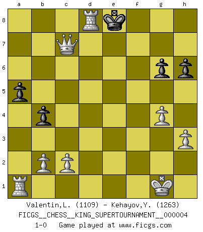 Last move : 1-0 2019 March 9 17:20:58 [Event "FICGS__CHESS__KING_SUPERTOURNAMENT__000004"] [Site "FICGS"] [Date "2018.12.16"] [Round "1"] [White "Valentin,Laurentiu"] [Black "Kehayov,Yulian"] [Result "1-0"] [WhiteElo "1109"] [BlackElo "1263"] 1.e4 e5 2.f4 exf4 3.Nf3 Nc6 4.d4 d6 5.Bxf4 Nf6 6.Bd3 Be7 7.O-O O-O 8.Nc3 Nh5 9.Be3 a6 10.Qd2 b5 11.a3 f5 12.exf5 Bxf5 13.Bxf5 Rxf5 14.g4 Nxd4 15.Bxd4 c5 16.Be3 Bg5 17.Bxg5 Rxg5 18.h3 Ng3 19.Rfd1 b4 20.axb4 cxb4 21.Nxg5 h6 22.Qd5+ Kh8 23.Nf7+ Kh7 24.Nxd8 Rxd8 25.Ne4 Nxe4 26.Qxe4+ g6 27.Qe7+ Kg8 28.Qxd8+ Kf7 29.Rxd6 a5 30.Qc7+ Ke8 31.Rd8+ 1-0 King's knight's gambit Kingside Castling by player White (move 7) Kingside Castling by player Black (move 7) Player White won this chess game. Follow this game move after move (download)Chess, like love, like music, has the power to make people happy. (Siegbert Tarrasch) Heutzutage gewinnt im Turnier nicht derjenige Spieler, der weitreichende Pläne entwirft, sondern einfach jener, der Zug um Zug kämpft. (David Bronstein) Yo no le temo a Spassky. Todos saben que yo soy el mejor. Uno no necesita un torneo para probarlo. (Bobby Fischer) Les échecs, c'est l'imagination. (David Bronstein) Every man's memory is his private literature. (Aldous Huxley)