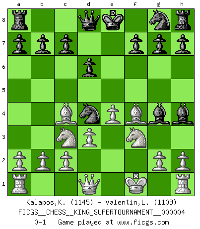 Last move : 0-1 2019 January 27 20:1:18 [Event "FICGS__CHESS__KING_SUPERTOURNAMENT__000004"] [Site "FICGS"] [Date "2018.12.16"] [Round "1"] [White "Kalapos,Karol"] [Black "Valentin,Laurentiu"] [Result "0-1"] [WhiteElo "1145"] [BlackElo "1109"] 1.e4 e5 2.f4 exf4 3.Nf3 Be7 4.Bc4 Bh4+ 5.Kf1 Nc6 6.d3 d6 7.Nc3 Bg4 8.Bxf4 Nd4 0-1 KGA : Cunningham defense Player Black won this chess game. Follow this game move after move (download)Modern Chess is too much concerned with things like Pawn structure. Forget it, Checkmate ends the game. (Nigel Short) Man gibt nur Pakete auf. (Paul Keres) Cuando la partida de Ajedrez termina, el Peón y el Rey regresan a la misma caja. (Irish saying) Les Echecs, c'est l'art de la guerre sans les charniers, c'est la résurrection des morts tombés au champ d'honneur, l'espoir perpétuel, la suprématie de l'intelligence sur la force, la culture de l'esprit. (F. Szpiner) It is the aim of the modern school, not to treat every position according to one general law, but according to the principle inherent in the position. (Richard Reti)