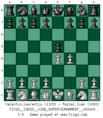 Last move : 1-0 2019 January 15 17:59:11 [Event "FICGS__CHESS__KING_SUPERTOURNAMENT__000004"] [Site "FICGS"] [Date "2018.12.16"] [Round "1"] [White "Valentin,Laurentiu"] [Black "Pezzei,Ivan"] [Result "1-0"] [WhiteElo "1109"] [BlackElo "1000"] 1.e4 e5 2.f4 1-0 This chess game has been lost on time (started : 2018.12.16 15:42:43) King's gambit Player White won this chess game. Follow this game move after move (download)It's always better to sacrifice your opponent's men. (Savielly Tartakover) Versuche, dich von der Sklaverei der Eröffnungsvarianten zu befreien. Stattdessen soll man gewisse Typenpositionen erlernen, die man eingehend analysiert. (Aaron Nimzowitsch) El jugador táctico sabe que hacer cuando hay algo que hacer; mientras que el estratega sabe que hacer cuando no hay nada que hacer. (Gerald Abrahams) Mais l'homme est une créature légère et illogique : semblable au joueur d'échecs, il n'aime que le processus du but à atteindre, non le but lui-même. (Dostoïevsky) Luck is the residue of design. (John Milton)
