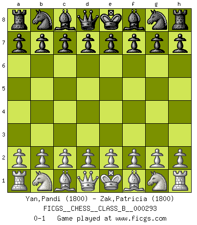Last move : 0-1 2019 January 25 18:58:14 [Event "FICGS__CHESS__CLASS_B__000293"] [Site "FICGS"] [Date "2018.12.16"] [Round "1"] [White "Yan,Pandi"] [Black "Zak,Patricia"] [Result "0-1"] [WhiteElo "1800"] [BlackElo "1800"] 0-1 This chess game has been lost on time (started : 2018.12.16 18:21:19) Player Black won this chess game. Follow this game move after move (download)At this time Fischer is simply a level above all the best Chessplayers in the world. (John Jacobs) Kasparov ist eine Art Monster mit hundert Augen, denen auch nicht das Geringste entgeht. (Tony Miles) Una buena memoria, concentración, imaginación y una fuerte voluntad, se requiere para llegar a ser un buen jugador. (Bobby Fischer) Le système Elo représente seulement une moyenne. Il est simplement un indicateur de votre stabilité. (Anatoli Karpov) Strategy without tactics is the slowest route to victory. Tactics without strategy is the noise before defeat. (Sun Tzu)