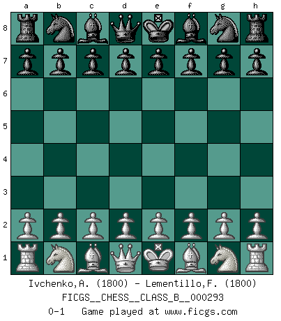 Last move : 0-1 2019 January 25 18:58:14 [Event "FICGS__CHESS__CLASS_B__000293"] [Site "FICGS"] [Date "2018.12.16"] [Round "1"] [White "Ivchenko,Alexander"] [Black "Lementillo,Francis"] [Result "0-1"] [WhiteElo "1800"] [BlackElo "1800"] 0-1 This chess game has been lost on time (started : 2018.12.16 18:21:19) Player Black won this chess game. Follow this game move after move (download)If cunning alone were needed to excel, women would be the best Chess players. (Albin) Das Schachspiel ist ein See, in welchem eine Mücke baden und ein Elefant ertrinken kann. (Emanuel Lasker) No solamente yo pronostico su triunfo sobre Botvinnik, sino que me adelanto y digo que probablemente Fischer es el jugador de Ajedrez mas grande que haya existido. (John Collins) Pour moi, les échecs ne sont pas un jeu mais un art. (Alexandre Alekhine) Warrior pose battles inner weakness and wins focus. You see that there is no war within you. You're on your own side, and you are your own strength. (Terri Guillemets)