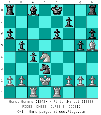 Last move : 0-1 2018 December 24 10:42:3 [Event "FICGS__CHESS__CLASS_E__000217"] [Site "FICGS"] [Date "2018.12.18"] [Round "1"] [White "Gonet,Gerard"] [Black "Pintor,Manuel"] [Result "0-1"] [WhiteElo "1242"] [BlackElo "1539"] 1.d4 d5 2.e4 c6 3.c4 e6 4.Nc3 Bb4 5.Qb3 Bxc3+ 6.Qxc3 h6 7.Be3 Nf6 8.e5 Ne4 9.Qc2 Qa5+ 10.Bd2 Nxd2 11.Qxd2 Qxd2+ 12.Kxd2 g5 13.Be2 Nd7 14.Nf3 c5 15.Rac1 cxd4 16.Nxd4 dxc4 17.Bg4 Nxe5 18.Be2 a6 19.Rhe1 b5 20.Bh5 Nd3 0-1 Blackmar gambit Player Black won this chess game. Follow this game move after move (download)Chess holds its master in its own bonds, shackling the mind and brain so that the inner freedom of the very strongest must suffer. (Albert Einstein) Rubinstein ist ein Turmendspiel, welches die Götter vor tausenden von Jahren begannen. (Savielly Grigorievitsch Tartakower) No hay un Gran Maestro de Ajedrez que sea normal; solo se diferencían ellos por la magnitud de su locura. (Viktor Korchnoi) Vous n'êtes pas toujours obligé de jouer le meilleur coup. Un coup doit être actif, entreprenant, correct et beau ! (David Bronstein) All war is based on deception. (Sun Tzu)