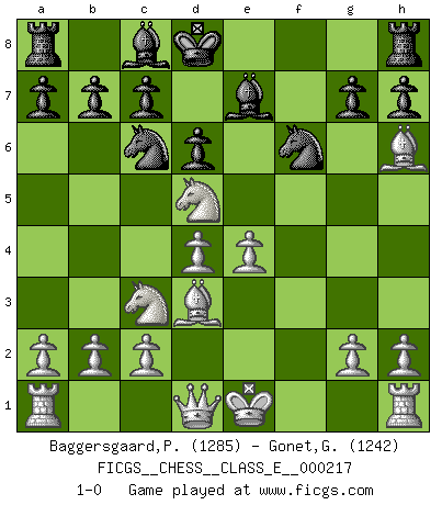 Last move : 1-0 2018 December 25 16:32:47 [Event "FICGS__CHESS__CLASS_E__000217"] [Site "FICGS"] [Date "2018.12.18"] [Round "1"] [White "Baggersgaard,Poulerik"] [Black "Gonet,Gerard"] [Result "1-0"] [WhiteElo "1285"] [BlackElo "1242"] 1.e4 e5 2.Nf3 f5 3.Nxe5 Qf6 4.d4 d6 5.Nc4 fxe4 6.Nc3 Qg6 7.f3 Nf6 8.fxe4 Nc6 9.Ne3 Be7 10.Bd3 Qh6 11.Ned5 Kd8 12.Bxh6 1-0 Latvian counter-gambit Player White won this chess game. Follow this game move after move (download)We must make sure that Chess will not be like a dead language, very interesting, but for a very small group. (Sytze Faber) Vielleicht wirkt die Aura früherer Spieler glanzvoller als die der heutigen Spieler, aber das liegt daran, dass man kein Programm wie Fritz hatte, das einem all die Löcher in ihren Partien zeigt. (Vladimir Kramnik) Después de una mala apertura, hay una esperanza en el juego medio. Pero una vez que estas en finales, el momento de la verdad ha llegado. (Edmar Mednis) Mais n'est-ce pas déjà le limiter injurieusement que d'appeler les échecs un jeu? N'est-ce pas aussi une science, un art, ou quelque chose qui, comme le cercueil de Mahomet entre ciel et terre, est suspendu entre l'un et l'autre, et qui réunit un nombre incroyable de contraires ? (Stefan Zweig) But they are useless. They can only give you answers. (Pablo Picasso, about computers)