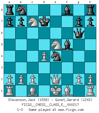 Last move : 1-0 2018 December 24 10:41:12 [Event "FICGS__CHESS__CLASS_E__000217"] [Site "FICGS"] [Date "2018.12.18"] [Round "1"] [White "Stevenson,Jack"] [Black "Gonet,Gerard"] [Result "1-0"] [WhiteElo "1558"] [BlackElo "1242"] 1.e4 e5 2.Nf3 f5 3.Nxe5 Qf6 4.d4 d6 5.Nc4 fxe4 6.Nc3 Qg6 7.f3 Nf6 8.fxe4 Nxe4 9.Qe2 d5 10.Nxd5 Bf5 11.Nxc7+ Kd7 12.Ne5+ 1-0 Latvian counter-gambit Player White won this chess game. Follow this game move after move (download)Avoid the crowd. Do your own thinking independently. Be the Chess player, not the Chess piece. (Ralph Charell) Ein guter Spieler hat immer Glück. (José Raúl Capablanca) Me dio la sensación de como si yo estuviera jugando en contra del mismo Ajedrez. - al estar jugando en contra de Robert Fischer (Walter Shipman) Les écrivains ont utilisé les échecs pour analyser les côtés extrêmes de la nature humaine. Dans ce cadre, les échecs offrent un champ d'expérimentation idéal. Mais on pourrait faire la même chose avec la peinture. Et là, en vous référant à Van Gogh, vous ne tirerez pas de conclusion définitive sur les peintres. (Gary Kasparov) Life is like a ten-speed bicycle: most of us have gears we never use. (Charles M. Schulz)