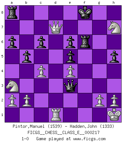 Last move : 1-0 2019 January 30 22:26:19 [Event "FICGS__CHESS__CLASS_E__000217"] [Site "FICGS"] [Date "2018.12.18"] [Round "1"] [White "Pintor,Manuel"] [Black "Hadden,John"] [Result "1-0"] [WhiteElo "1539"] [BlackElo "1333"] 1.e4 e5 2.f4 Nc6 3.Nf3 exf4 4.d4 g5 5.Bc4 d6 6.O-O Bg7 7.c3 Be6 8.d5 Na5 9.dxe6 Nxc4 10.Qa4+ Ke7 11.Qxc4 fxe6 12.Nxg5 Qd7 13.Bxf4 h6 14.Nh3 b5 15.Qb3 Be5 16.Bxe5 dxe5 17.Na3 a6 18.c4 c6 19.Qb4+ Qd6 20.Qa5 Nf6 21.Rad1 Qc5+ 22.Kh1 Rhc8 23.Qd2 h5 24.Qh6 Rf8 25.Ng5 Qe3 26.Qg7+ Ke8 27.Rxf6 Rxf6 28.Qd7+ Kf8 29.Nh7+ 1-0 King's gambit Kingside Castling by player White (move 6) Player White won this chess game. Follow this game move after move (download)The mistakes are there, waiting to be made. (Savielly Tartakower) Wir irren allesamt, nur jeder irrt anders. (Georg Christoph Lichtenberg) La captura del Rey enemigo es la finalidad pero no el primer objetivo de la partida. (William Steinitz) Karpov est une pièce de musée. (Garry Kasparov) Perception is reality. (Immanuel Kant)