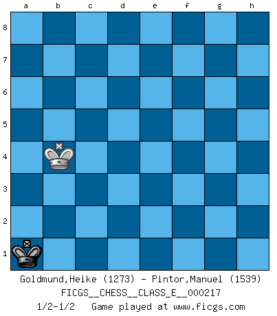 Last move : 1/2-1/2 2019 February 27 13:2:18 [Event "FICGS__CHESS__CLASS_E__000217"] [Site "FICGS"] [Date "2018.12.18"] [Round "1"] [White "Goldmund,Heike"] [Black "Pintor,Manuel"] [Result "1/2-1/2"] [WhiteElo "1273"] [BlackElo "1539"] 1.b4 e5 2.Bb2 Qf6 3.a3 Nc6 4.b5 Bc5 5.e3 Na5 6.c4 d6 7.Nf3 Bg4 8.Be2 Ne7 9.d3 O-O 10.O-O Nf5 11.Nbd2 h6 12.Ne4 Qg6 13.Nxc5 Bxf3 14.Bxf3 dxc5 15.Bxe5 Rac8 16.Qa4 b6 17.Qc2 Nh4 18.Be4 Qg5 19.Bg3 f5 20.Bd5+ Kh8 21.Rad1 c6 22.Be6 Rce8 23.Bd7 Re7 24.Bxc6 Rc8 25.Bd5 Rd8 26.f4 Qh5 27.Qf2 g5 28.fxg5 hxg5 29.Bxh4 gxh4 30.Qxf5 Qxf5 31.Rxf5 Rxe3 32.Rh5+ Kg7 33.Rxh4 Kf6 34.Rf4+ Ke5 35.Re4+ Rxe4 36.Bxe4 Kd4 37.g4 Nb3 38.Kg2 Kc3 39.Kf2 Nd2 40.Rc1+ Kb2 41.Rd1 Nxe4+ 42.Ke3 Nf6 43.g5 Ng4+ 44.Ke4 Nxh2 45.Rd2+ Kc3 46.Rxh2 Rxd3 47.Rg2 Rd8 48.g6 Kxc4 49.Kf5 Kxb5 50.g7 Rg8 51.Kf6 Ka4 52.Kf7 Rxg7+ 53.Rxg7 Kxa3 54.Ke6 a6 55.Kd6 Kb4 56.Kc6 b5 57.Rg4+ c4 58.Kb6 a5 59.Rg5 a4 60.Rxb5+ Kc3 61.Kc5 a3 62.Ra5 Kb3 63.Rb5+ Kc3 64.Rb4 a2 65.Rxc4+ Kb2 66.Rb4+ Ka3 67.Kb5 a1Q 68.Ra4+ Kb2 69.Rxa1 Kxa1 70.Kb4 1/2-1/2 Polish (Sokolsky) opening Kingside Castling by player Black (move 9) Kingside Castling by player White (move 10) 10 pieces endgame at move 48 : White KRPPP , Black KRPPP WHITE : King + 1 Rook 3 Pawns BLACK : King + 1 Rook 3 Pawns 9 pieces endgame at move 49 : White KRPP , Black KRPPP WHITE : King + 1 Rook 2 Pawns BLACK : King + 1 Rook 3 Pawns 8 pieces endgame at move 52 : White KRP , Black KRPPP WHITE : King + 1 Rook 1 Pawn BLACK : King + 1 Rook 3 Pawns 7 pieces endgame at move 53 : White KRP , Black KPPP WHITE : King + 1 Rook 1 Pawn BLACK : King + 3 Pawns 6 pieces endgame at move 53 : White KR , Black KPPP WHITE : King + 1 Rook BLACK : King + 3 Pawns 5 pieces endgame at move 60 : White KR , Black KPP WHITE : King + 1 Rook BLACK : King + 2 Pawns 4 pieces endgame at move 65 : White KR , Black KP WHITE : King + 1 Rook BLACK : King + 1 Pawn Promotion Queen by player Black (move 67) 3 pieces endgame at move 69 : White KR , Black K WHITE : King + 1 Rook BLACK : King + 2 pieces endgame at move 69 : White K , Black K WHITE : King + BLACK : King + This chess game ended in a draw. Follow this game move after move (download)Chess is a fighting game which is purely intellectual and includes chance. (Richard Reti) Alles was ich jemals tun will ist Schach spielen. (Robert James Fischer) El Ajedrez es un terrible juego. Si no controlas el centro, tu oponente tiene una posición mas holgada. Si tienes control del centro, ¡entonces realmente tu tienes algo de que preocuparte!. (Siegbert Tarrasch) L'ordinateur a tué l'originalité. Il n'y a plus guère d'aventures sur l'échiquier. (Jacob Murray) The quality of decision is like the well-timed swoop of a falcon which enables it to strike and destroy its victim. (Sun Tzu)