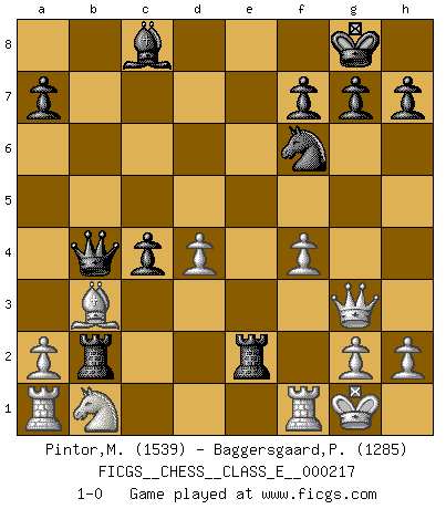 Last move : 1-0 2019 March 3 10:9:20 [Event "FICGS__CHESS__CLASS_E__000217"] [Site "FICGS"] [Date "2018.12.18"] [Round "1"] [White "Pintor,Manuel"] [Black "Baggersgaard,Poulerik"] [Result "1-0"] [WhiteElo "1539"] [BlackElo "1285"] 1.e4 e6 2.f4 d5 3.exd5 exd5 4.d4 Bd6 5.Nf3 Nf6 6.Bd3 O-O 7.O-O c5 8.c3 Nc6 9.Ne5 cxd4 10.Nxc6 bxc6 11.cxd4 c5 12.Be3 Re8 13.Qf3 c4 14.Bc2 Rb8 15.b3 Qa5 16.bxc4 Rb2 17.Bb3 dxc4 18.Bd2 Bb4 19.Bxb4 Qxb4 20.Qc3 R8e2 21.Qg3 1-0 French : Labourdonnais variation Kingside Castling by player Black (move 6) Kingside Castling by player White (move 7) Player White won this chess game. Follow this game move after move (download)All I want to do, ever, is just play Chess. (Bobby Fischer) Es ist wirklich schade, dass so viele Schachspieler nicht auf ihr Äußeres achten! (Alexandra Kosteniuk) El Peón aislado arroja penumbra sobre todo el tablero. (Aaron Nimzovich) Toute estimation doit être constamment réévaluée. (Jacob Estrin) If only people were all showed a certain minimum level of niceness; if only people didn't retract verbal draw offers (without draw box ticked) on ficgs; if only people didn't kill; if only people didn't run concentration / extermination camps, if only people didn't drop nuclear bombs on Hiroshima and Nagasaki, and so on - it would be a much more beautiful world. But sadly, things are not so... (Normajean Yates)