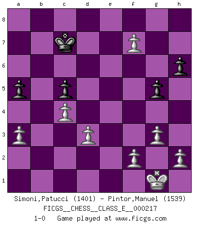 Last move : 1-0 2019 March 12 12:9:25 [Event "FICGS__CHESS__CLASS_E__000217"] [Site "FICGS"] [Date "2018.12.18"] [Round "1"] [White "Simoni,Patucci"] [Black "Pintor,Manuel"] [Result "1-0"] [WhiteElo "1401"] [BlackElo "1539"] 1.Nf3 Nc6 2.c4 e5 3.g3 Qf6 4.Nc3 Bc5 5.Nd5 Qd8 6.b4 Bxb4 7.Nxb4 Nxb4 8.Nxe5 Qf6 9.Bb2 c5 10.Rb1 Qf5 11.d3 d6 12.Qa4+ Kf8 13.a3 Na6 14.e4 Qe6 15.Nf3 Bd7 16.Qc2 Nf6 17.Bg2 h6 18.O-O Re8 19.Bxf6 Qxf6 20.Rxb7 Bg4 21.Nh4 g5 22.Nf5 Bxf5 23.exf5 Re7 24.Rxe7 Qxe7 25.Qc3 Qe5 26.Qxe5 dxe5 27.f6 Ke8 28.Re1 Kd7 29.Rxe5 Re8 30.Bc6+ Kxc6 31.Rxe8 Kd6 32.Re7 Nc7 33.Rxf7 a5 34.Rxc7 Kxc7 35.f7 1-0 Reti Opening Kingside Castling by player White (move 18) Player White won this chess game. Follow this game move after move (download)The laws of Chess do not permit a free choice: you have to move whether you like it or not. (Emanuel Lasker) Schach ist ein schwarz-weisser Dschungel. (Garry Kasparov) El Ajedrez es sobre todo, ¡una pelea!. (Emanuel Lasker) Ce n'est pas pour s'amuser qu'il joue aux échecs : il célèbre un culte. (Vladimir Nabokov) If you are good, you will be assigned all the work. If you are really good, you will get out of it. (Dan Rotaru)
