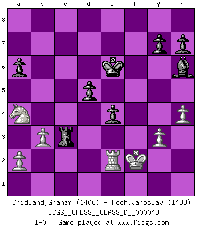 Last move : 1-0 2008 March 4 3:1:47 [Event "FICGS__CHESS__CLASS_D__000048"] [Site "FICGS"] [Date "2007.05.28"] [Round "1"] [White "Cridland,Graham"] [Black "Pech,Jaroslav"] [Result "1-0"] [WhiteElo "1406"] [BlackElo "1433"] 1.e4 c5 2.Nf3 Nc6 3.d4 cxd4 4.Nxd4 Nf6 5.Nc3 e5 6.Ndb5 d6 7.Bg5 a6 8.Na3 b5 9.Nd5 Be7 10.Bxf6 Bxf6 11.g3 O-O 12.Bg2 Bg5 13.O-O Ne7 14.Nxe7+ Qxe7 15.c4 Rb8 16.Qd3 Bd7 17.Rfd1 Bg4 18.Bf3 bxc4 19.Nxc4 Be6 20.b3 Rfd8 21.Na5 Qc7 22.Nc4 Rb5 23.h4 Bh6 24.Rab1 Rc5 25.Na3 Rc3 26.Qe2 f5 27.exf5 Bxf5 28.Be4 Rf8 29.Bxf5 Rxf5 30.Nc4 Qc5 31.Rd3 Rxf2 32.Qxf2 Qxf2+ 33.Kxf2 Rxd3 34.Rb2 e4 35.Re2 d5 36.Ne5 Rc3 37.Nd7 Kf7 38.Nb6 Ke6 39.Na4 1-0 This chess game has been lost on time (started : 2007.05.28 8:40:6) Comment by player 1 : Graham Cridland : I enjoy playing this line. I realize g2-g3 is a bit off the beaten way, but it seems to fit the requirements of the position as well, if not better, than the standard plan with c2-c3 and Bd3. An interesting treatment, usually I get 15...b4 16 Nc2 a5 17 h4 Bh6 (leaving the h6-c1 diagonal allows Ne3-d5) 18 a3. 26...f5 seems to give White a lot of the things he wants; getting the light square bishops off frees the knight on a3 for activity. Of course, Black is active too. 26...g6, playing for ...d6-d5, was expected. Sicilian : Pelikan (Lasker/Sveshnikov) variation Kingside Castling by player Black (move 11) Kingside Castling by player White (move 13) Player White won this chess game. Follow this game move after move (download)My style is somewhere between that of Tal and Petrosian. (Reshevsky) Es ist besser die Steine des Gegners zu opfern. (Savielly Grigorievitsch Tartakower) Aún el Rey más flojo huye despavorido ante la amenaza de un Jaque doble. (Aaron Nimzowitsch) Fischer est le meilleur joueur du monde et Karpov n'est qu'un joueur de bistrot. (Garry Kasparov, agé de 16 ans) Knowledge rests not upon truth alone, but upon error also. (Carl G. Jung)