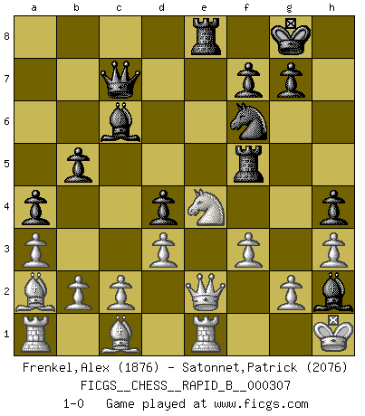 Last move : 1-0 2019 March 7 10:31:20 [Event "FICGS__CHESS__RAPID_B__000307"] [Site "FICGS"] [Date "2018.12.18"] [Round "1"] [White "Frenkel,Alex"] [Black "Satonnet,Patrick"] [Result "1-0"] [WhiteElo "1876"] [BlackElo "2076"] 1.e4 e5 2.Nf3 Nc6 3.Bb5 Nd4 4.Nxd4 exd4 5.O-O h5 6.d3 c6 7.Bc4 d5 8.exd5 cxd5 9.Re1+ Be7 10.Bb3 Bg4 11.Qd2 Kf8 12.Qf4 Qb6 13.Bxd5 Nf6 14.Bb3 Bd6 15.Qg5 h4 16.h3 Bd7 17.Nd2 Rh5 18.Nc4 Qc7 19.Qd2 Bh2+ 20.Kh1 b5 21.Qb4+ Kg8 22.Nd2 a5 23.Qe7 Rf8 24.a3 a4 25.Ba2 Rf5 26.Qe2 Bc6 27.Ne4 Re8 28.f3 1-0 This chess game has been lost on time (started : 2018.12.18 21:28:30) Ruy Lopez : Bird's defense Kingside Castling by player White (move 5) Player White won this chess game. Follow this game move after move (download)Chess is a more highly symbolic game, but the aggressions are therefore even more frankly represented in the play. It probably began as a war game; that is, the representation of a miniature battle between the forces of two kingdoms. (Karl Meninger) Nie in meinem Leben habe ich die französische Verteidigung gespielt, welche die Stumpfsinnigste von allen ist. (Wilhelm Steinitz) A la fecha, Fischer esta simplemente un nivel arriba de todos los mejores jugadores de Ajedrez del mundo. (John Jacobs) Avec des compensations pour le matériel en plus... (Anonyme) To be champion requires more than simply being a strong player; one has to be a strong human being as well. (Anatoly Karpov)