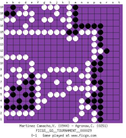 Last move : 0-1 2019 April 26 15:5:7 [Event "FICGS__GO__TOURNAMENT__000029"] [Site "FICGS"] [Date "2018.12.19"] [Round "1"] [Black "Martinez Camacho,Victor Hugo"] [White "Agronow,Cosmo"] [Result "0-1"] [Rating 1 "0944"] [Rating 2 "0251"] 1.q16 d4 2.q4 d16 3.k16 o3 4.q10 o9 5.p7 n6 6.o4 n4 7.p4 p11 8.p10 o10 9.p9 o7 10.p8 o8 11.o6 o5 12.p5 p6 13.q6 o6 14.p3 n15 15.n16 n3 16.o2 n2 17.q11 p13 18.q13 q12 19.r12 p12 20.q14 k15 21.l15 l14 22.m15 m14 23.o16 o15 24.p16 p15 25.q15 p14 26.n1 m1 27.j16 j15 28.h16 h15 29.g16 g15 30.f16 f15 31.e16 e15 32.d17 d15 33.c16 c15 34.b16 b15 35.a16 a15 36.d10 e10 37.d9 e9 38.e8 f8 39.e7 f7 40.e6 f6 41.e5 f5 42.e4 f4 43.e3 f3 44.d3 d11 45.c10 c11 46.b10 b11 47.a10 a11 48.c4 e2 49.d5 d2 50.c3 c2 51.b3 b2 52.a3 a2 53.o1 p2 54.q2 p1 55.q1 c7 56.h8 l16 57.m16 l17 58.m17 d8 59.d7 c8 60.c6 b9 61.a9 a8 62.b5 a5 63.a4 a6 64.b6 c9 65.h7 h9 66.j8 j9 67.k8 k9 68.l8 l9 69.m8 m9 70.m7 m6 71.j6 l6 72.k6 k5 73.h6 j5 74.k7 h5 75.g6 g8 76.g7 n8 77.n7 l7 78.q3 k17 79.m18 l18 80.m19 l19 81.j17 j18 82.h18 h19 83.g18 e17 84.f18 e18 85.f17 g19 86.f19 j19 87.e19 d18 88.c17 c18 89.b18 a17 90.b19 b17 91.a18 d19 92.g5 g4 93.q5 h17 94.q9 g17 95.q7 j7 0-1 Here are the names of the openings (joseki) played in the four corners : Corner q4 : q4 o3 Hoshi (Hwajeom, Seongjeom, Xingwei`) 4-4 Point. The star or hoshi (4-4) point, emphasizing influence at the potential expense of territory. Ikken Kakari (Hankan Keolch'im, Yi Gua`jiao~, 1-Space Low Approach). White 2 is the standard approach move to the 4-4. Corner q16 : q16 p11 Hoshi (Hwajeom, Seongjeom, Xingwei`) 4-4 Point. The star or hoshi (4-4) point, emphasizing influence at the potential expense of territory. Corner d16 : d16 j16 Hoshi (Hwajeom, Seongjeom, Xingwei`) 4-4 Point. The star or hoshi (4-4) point, emphasizing influence at the potential expense of territory. Corner d4 : d4 d9 Hoshi (Hwajeom, Seongjeom, Xingwei`) 4-4 Point. The star or hoshi (4-4) point, emphasizing influence at the potential expense of territory. Player White won this Go (weiqi, baduk) game. Follow this game move after move (download)Be a little patient. Keshi works ! (Anonymous) Always remember that you are unique; just like everyone else. (Unknown)