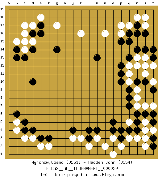 Last move : 1-0 2019 March 3 1:27:53 [Event "FICGS__GO__TOURNAMENT__000029"] [Site "FICGS"] [Date "2018.12.19"] [Round "1"] [Black "Agronow,Cosmo"] [White "Hadden,John"] [Result "1-0"] [Rating 1 "0251"] [Rating 2 "0554"] 1.q16 c16 2.d4 q3 3.e17 d17 4.d16 c17 5.c13 c14 6.d14 d15 7.b14 c15 8.e16 k16 9.m13 n16 10.g14 g17 11.b13 b15 12.d10 q10 13.o5 q5 14.p12 q12 15.q13 r12 16.q7 p16 17.p15 p17 18.q15 q17 19.r17 r18 20.r16 r7 21.p3 p2 22.o2 o3 23.p4 n2 24.l3 m3 25.m4 l2 26.o4 o1 27.q4 r3 28.r4 s4 29.r5 s5 30.r6 r8 31.q9 r9 32.q8 d3 33.e3 c3 34.c4 b4 35.b6 b5 36.c5 e18 37.p10 q11 38.p11 r13 39.r14 k3 40.l4 j3 41.j4 e2 42.f3 f2 43.s6 s7 44.t6 s3 45.t5 t7 46.s14 s13 47.t13 t12 48.t14 s17 49.s16 s18 50.t3 t4 51.t2 s2 52.t11 s12 53.r10 s11 54.s10 t10 55.t9 1-0 Here are the names of the openings (joseki) played in the four corners : Corner d16 : c16 e17 Komoku (Somok, Xiao~mu`) 3-4 Point. The komoku (3-4) point is the traditional corner enclosure move.. Ikken Kakari (Hankan Keolch'im, Yi Gua`jiao~, 1-Space Low Pincer). The small knight move is the basic approach move to the 3-4 point stone. It has been continually used for over four centuries. There are limitless variations, with new moves constantly being discovered. Black 2 opens the door to a treaure store of joseki. Corner q4 : q3 o5 Komoku (Somok, Xiao~mu`) 3-4 Point. The komoku (3-4) point is the traditional corner enclosure move.. Corner d4 : d4 d3 Hoshi (Hwajeom, Seongjeom, Xingwei`) 4-4 Point. The star or hoshi (4-4) point, emphasizing influence at the potential expense of territory. Player Black won this Go (weiqi, baduk) game. Follow this game move after move (download)Attach to the strongest stone in a pincer. (Anonymous) Hold em is to stud what chess is to checkers. (Johnny Moss)