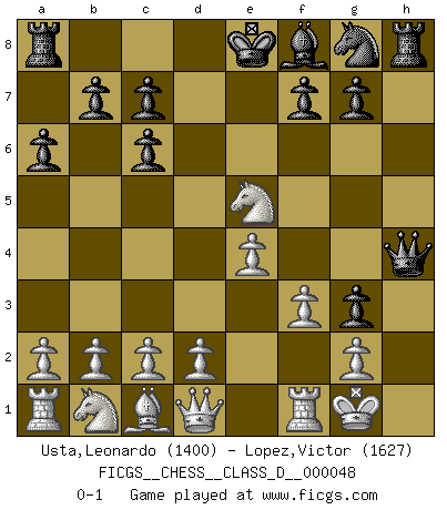 Last move : 0-1 2007 June 1 18:0:29 [Event "FICGS__CHESS__CLASS_D__000048"] [Site "FICGS"] [Date "2007.05.28"] [Round "1"] [White "Usta,Leonardo"] [Black "Lopez,Victor"] [Result "0-1"] [WhiteElo "1400"] [BlackElo "1627"] 1.e4 e5 2.Nf3 Nc6 3.Bb5 a6 4.Bxc6 dxc6 5.O-O Bg4 6.h3 h5 7.hxg4 hxg4 8.Nxe5 Qh4 9.f3 g3 0-1 Ruy Lopez : Exchange variation, Alapin gambit Kingside Castling by player White (move 5) Player Black won this chess game. Follow this game move after move (download)Fischer prefers to enter Chess history alone. (Miguel Najdorf) Sicherlich können nur Meister einen Stil haben. Daß ein nicht-Meister auch nur ein einziges Mal in seinem Leben eine Partie folgerecht durchführte, habe ich niemals bemerkt. (Emanuel Lasker) Repentinamente, me resultaba obvio en mi analisis que yo había pasado por alto lo que Fischer había visto en el tablero con la mas grande facilidad. (Mikhail Botvinnik) Aidez vos pièces, elles vous aideront. (Paul Morphy) Unless I accept my faults I will most certainly doubt my virtues. (Hugh Prather)
