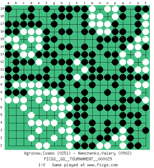 Last move : 1-0 2019 April 28 16:23:53 [Event "FICGS__GO__TOURNAMENT__000029"] [Site "FICGS"] [Date "2018.12.19"] [Round "1"] [Black "Agronow,Cosmo"] [White "Nemchenko,Valery"] [Result "1-0"] [Rating 1 "0251"] [Rating 2 "0902"] 1.q16 d4 2.q4 d16 3.d10 e8 4.f9 f8 5.f15 e16 6.f16 e15 7.q10 o14 8.h4 g6 9.h6 h7 10.h8 g8 11.g9 e9 12.e10 d9 13.j7 g7 14.e5 d5 15.d6 c6 16.e6 e4 17.g5 f6 18.f5 e7 19.d7 d8 20.c8 c9 21.c10 c7 22.b8 b9 23.b10 b7 24.a8 j8 25.h9 j6 26.a9 h5 27.k7 g4 28.k5 f4 29.k9 a7 30.a10 j4 31.j5 h3 32.k3 k6 33.l6 f10 34.f11 g10 35.h10 g11 36.g12 h11 37.j11 k8 38.h6 j9 39.h12 k10 40.l12 l9 41.m9 m10 42.n10 l11 43.m11 m8 44.l10 n9 45.m10 l7 46.m7 n7 47.l8 j6 48.k9 n8 49.j10 m6 50.l7 m5 51.o10 o9 52.p9 p8 53.q8 p7 54.n6 n5 55.o6 o5 56.p6 p5 57.q6 o7 58.q5 p4 59.q7 q3 60.r3 q2 61.p3 p2 62.o3 n3 63.o2 o1 64.n2 m2 65.m3 n4 66.l2 m1 67.l1 n1 68.p1 q1 69.r2 o1 70.l5 n1 71.m4 m2 72.o4 j3 73.k4 j2 74.k6 h6 75.r1 k2 76.k1 j1 77.g3 g2 78.f3 e3 79.f2 f1 80.e2 d2 81.o8 e1 82.f10 f17 83.g17 f18 84.g18 g19 85.h19 f19 86.h18 e14 87.e17 e18 88.d17 d18 89.c17 c16 90.c18 b18 91.b17 c19 92.d19 e19 93.d19 b19 94.a17 a18 95.b16 b15 96.f14 a15 97.e13 d13 98.d14 c14 99.d12 c13 100.c12 b12 101.b11 a12 102.a11 p14 103.q14 q13 104.n14 n13 105.m13 m14 106.n15 l13 107.m12 n12 108.p15 o11 109.p10 p11 110.q11 q12 111.r13 r14 112.q15 r12 113.s12 s13 114.r11 s11 115.s10 t12 116.t10 t11 117.r15 s15 118.s16 t16 119.s17 t17 120.s18 t18 121.s19 t15 122.t19 n17 123.n11 o12 124.l14 m15 125.o15 n16 126.p13 l15 127.k13 k14 128.t14 s14 129.o13 l13 130.p12 k12 131.l14 j13 132.l13 j15 133.j12 h13 134.h14 g14 135.g13 h15 136.j14 k15 137.m16 m17 138.l16 k16 139.l17 k17 140.l18 k18 141.k19 m18 142.l19 m19 143.j19 h17 144.h16 j17 145.j18 g16 146.g15 d15 147.j16 o16 148.p17 o17 149.o18 p18 150.p16 o19 151.q18 p19 152.q19 n18 153.m1 s3 154.s4 s2 155.s1 t2 156.a16 t1 157.t3 t9 158.t8 s9 159.r10 s8 160.s7 t7 161.t6 t5 162.t8 s6 163.r7 t7 164.s5 r6 165.r5 e19 166.d18 f18 167.a19 f17 168.b13 a13 169.a14 b14 170.a13 a12 171.b12 e12 172.f13 e18 173.f19 t4 174.t6 1-0 Here are the names of the openings (joseki) played in the four corners : Corner d16 : d16 f15 Hoshi (Hwajeom, Seongjeom, Xingwei`) 4-4 Point. The star or hoshi (4-4) point, emphasizing influence at the potential expense of territory. Corner q16 : q16 o14 Hoshi (Hwajeom, Seongjeom, Xingwei`) 4-4 Point. The star or hoshi (4-4) point, emphasizing influence at the potential expense of territory. Player Black won this Go (weiqi, baduk) game. Follow this game move after move (download)Always remember, keep the balance. [between territory and influence] (Figaro) Knowledge rests not upon truth alone, but upon error also. (Carl G. Jung)