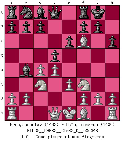 Last move : 1-0 2007 August 5 14:9:19 [Event "FICGS__CHESS__CLASS_D__000048"] [Site "FICGS"] [Date "2007.05.28"] [Round "1"] [White "Pech,Jaroslav"] [Black "Usta,Leonardo"] [Result "1-0"] [WhiteElo "1433"] [BlackElo "1400"] 1.d4 d5 2.c4 e6 3.Nc3 Bb4 4.Nf3 Nf6 5.Bg5 O-O 6.e3 h6 7.Bxf6 1-0 This chess game has been lost on time (started : 2007.05.28 8:40:6) QGD : 3.Nc3 Kingside Castling by player Black (move 5) Player White won this chess game. Follow this game move after move (download)The beauty of a move lies not in its' appearance but in the thought behind it. (Siegbert Tarrasch) Ich verstehe mehr vom Schach als irgendein anderer lebender Meister. (José Raúl Capablanca) Aún deseo matar a Fischer. (Boris Spassky) Tout change constamment, y compris dans le monde des Echecs. (Botvinnik) The weakness of an artist is dogma. (Josh Waitzkin)