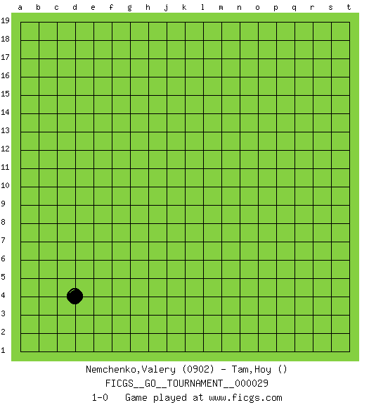 Last move : 1-0 2019 January 18 18:9:39 [Event "FICGS__GO__TOURNAMENT__000029"] [Site "FICGS"] [Date "2018.12.19"] [Round "1"] [Black "Nemchenko,Valery"] [White "Tam,Hoy"] [Result "1-0"] [Rating 1 "0902"] 1.d4 1-0 This go game has been lost on time (started : 2018.12.19 8:13:36) Here are the names of the openings (joseki) played in the four corners : Corner d4 : d4 1-0 Hoshi (Hwajeom, Seongjeom, Xingwei`) 4-4 Point. The star or hoshi (4-4) point, emphasizing influence at the potential expense of territory. Player Black won this Go (weiqi, baduk) game. Follow this game move after move (download)If a formation is symmetrical, play at the center. (Anonymous) Perfection is achieved, not when there is nothing more to add, but when there is nothing left to take away. (Antoine de Saint-Exupéry)