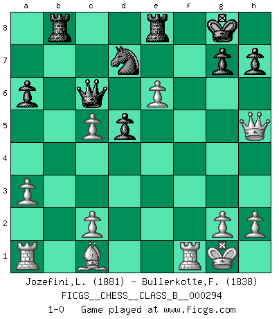 Last move : 1-0 2019 March 8 22:32:35 [Event "FICGS__CHESS__CLASS_B__000294"] [Site "FICGS"] [Date "2018.12.22"] [Round "1"] [White "Jozefini,Lubor"] [Black "Bullerkotte,Frank"] [Result "1-0"] [WhiteElo "1881"] [BlackElo "1838"] 1.e4 c6 2.d4 d5 3.f3 e6 4.Nc3 Bb4 5.Qd3 Nf6 6.e5 Nfd7 7.f4 c5 8.a3 Bxc3+ 9.Qxc3 cxd4 10.Qxd4 Nc6 11.Qe3 f6 12.exf6 Qxf6 13.Nf3 O-O 14.Bb5 a6 15.Bxc6 bxc6 16.O-O c5 17.Ng5 Re8 18.f5 e5 19.b4 Rb8 20.bxc5 Qc6 21.Ne6 Nf6 22.Qxe5 Bxe6 23.fxe6 Nd7 24.Qh5 1-0 Caro-Kann : Tartakower (fantasy) variation Kingside Castling by player Black (move 13) Kingside Castling by player White (move 16) Player White won this chess game. Follow this game move after move (download)Chess is played with the mind and not with the hands ! (Renaud and Kahn) Ohne Leiden bildet sich kein Charakter. (Ernst Freiherr von Feuchtersleben) Nunca antes ha habido un jugador de Ajedrez con tal conocimiento a fondo de las complejidades del juego y una inmensa voluntad absolutamente indomable de ganar. Yo pienso que Fischer es el jugador mas grande que jamás haya existido. (Lisa Lane) Les échecs c'est le défi de l'alpiniste, toujours plus haut, prêt à tout pour monter à l'assaut du Roi ennemi. Les échecs, c'est de la musique en mouvement, un ballet majestueux pour les yeux. C'est de la poésie composée par les fantômes du passé qui au même titre que Rimbaud ou Verlaine méritent notre admiration. Les échecs, c'est de la peinture ou le moindre mouvement modifie le tableau pour en faire un Picasso ou un Van Gogh. Les échecs, c'est tout et rien, c'est la vie et la mort. Jjulie33 sur le forum de France-Echecs. The problem with troubleshooting is that trouble shoots back. (Anonymous)