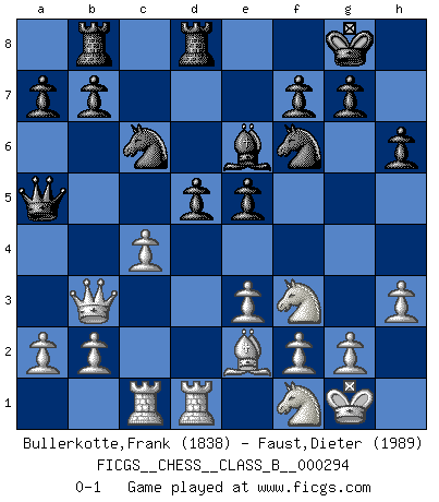 Last move : 0-1 2019 March 8 22:32:35 [Event "FICGS__CHESS__CLASS_B__000294"] [Site "FICGS"] [Date "2018.12.22"] [Round "1"] [White "Bullerkotte,Frank"] [Black "Faust,Dieter"] [Result "0-1"] [WhiteElo "1838"] [BlackElo "1989"] 1.d4 d5 2.Bf4 Bg4 3.c3 Nc6 4.Nd2 Nf6 5.Qb3 Rb8 6.h3 Bf5 7.Ngf3 e6 8.e3 Bd6 9.Bxd6 cxd6 10.Be2 O-O 11.O-O e5 12.Rfd1 h6 13.Nf1 Be6 14.dxe5 dxe5 15.c4 Qa5 16.Rac1 Rfd8 0-1 Queen's pawn, Mason variation Kingside Castling by player Black (move 10) Kingside Castling by player White (move 11) Player Black won this chess game. Follow this game move after move (download)Half the variations which are calculated in a tournament game turn out to be completely superfluous. Unfortunately, no one knows in advance which half. (Jan Tinman) Ein Schachgenie ist jemand der verdammt gut Schach spielt. (Jonathan Levitt) Hoy en día, si tu no eres un Gran Maestro a los 14 años, es mejor que lo olvides. (Anand Viswanathan) Le pion, dans sa simplicité, marche droit devant lui, mais lorsqu'il prend, il le fait obliquement? Ainsi l'homme, tant qu'il reste pauvre, marche dans la droiture et vit honnêtement, mais lorsqu'il recherche les honneurs, il flatte, se parjure et, par les voies obliques, cherche une position supérieure sur l'échiquier du monde. (Jean de Galles) I teach you to lie, cheat and steal, and as soon as my back's turned you wait in line ? (Gregory House, House M.D.)