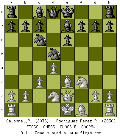 Last move : 0-1 2019 March 1 10:0:15 [Event "FICGS__CHESS__CLASS_B__000294"] [Site "FICGS"] [Date "2018.12.22"] [Round "1"] [White "Satonnet,Patrick"] [Black "Rodriguez Perez,Rene"] [Result "0-1"] [WhiteElo "2076"] [BlackElo "2050"] 1.e4 e6 2.d4 d5 3.Be3 dxe4 4.Nd2 Nf6 5.f3 Nd5 6.Qe2 Nc6 7.c3 exf3 8.Ngxf3 Be7 0-1 This chess game has been lost on time (started : 2018.12.22 17:52:2) French : Alapin variation Player Black won this chess game. Follow this game move after move (download)Spassky will not be psyched out by Fischer. (Mike Goodall) Darum geht es im Schach. Einen Tag gibst du deinem Gegner eine Lektion, am nächsten Tag gibt er dir eine. (Robert James Fischer) Los asuntos humanos son como una partida de Ajedrez: solo aquellos que no lo toman seriamente, pueden ser llamados buenos jugadores. (Hung Tzu Ch'eng) J'ai vu le vaincu d'Echecs jouer des années durant dans l'espoir de la fête de la victoire. Car tu es plus riche de ce qu'elle existe si même elle n'est point pour toi. Ainsi de la perle du fond des mers. (Antoine de Saint-Exupéry) If only faces could talk... (Pat Summerall, Sportscaster during the Super Bowl)